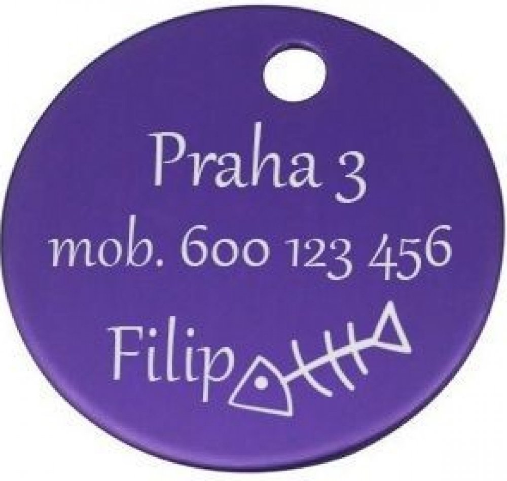 Hliníková identifikační psí známkaZa příplatek lze jednostranně nebo oboustranně opatřit destičku rytinou textu nebo drobným obrázkemPřívěšek má povrchovou úpravu v růžové barvě