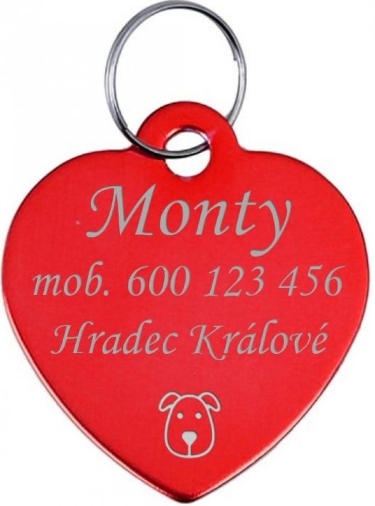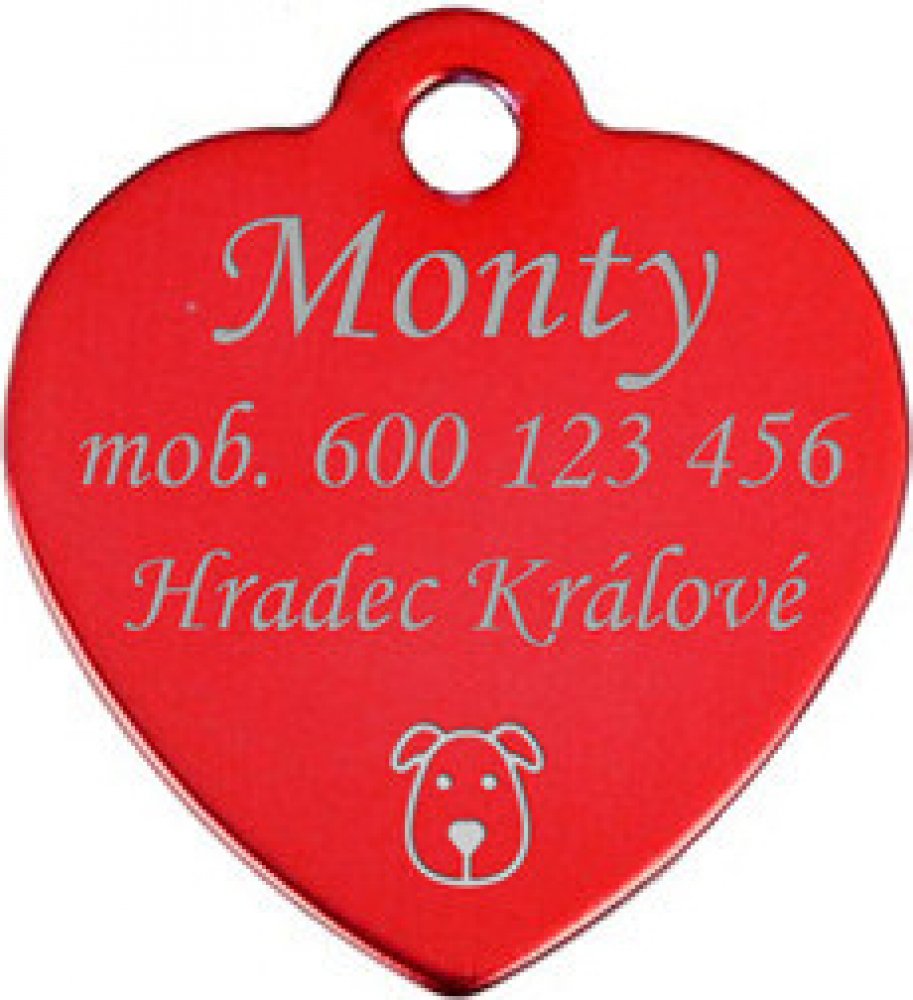 Hliníková identifikační psí známkaZa příplatek lze jednostranně nebo oboustranně opatřit destičku rytinou textu nebo drobným obrázkemPřívěšek má barevnou povrchovou úpravu