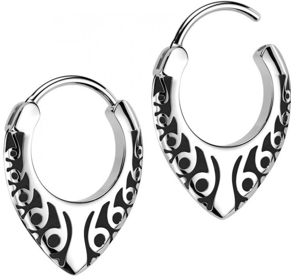 Ocelové náušnice ve tvaru visacích kruhů dekorvaných černými ornamenty