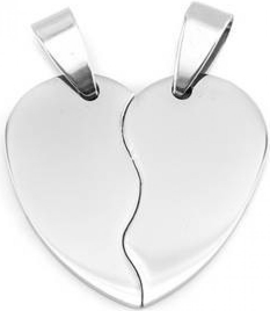 2 kusy párových ocelových přívěsků - zlomené srdce.Na zakázku lze na přívěsky vyrýt text diamantovým hrotem nebo laserem.Obě poloviny přívěsku mají z obou stran lesklou povrchovou úpravu.Ocelový přívěsek je vyroben z chirurgické oceli s jakostním označením 316L.