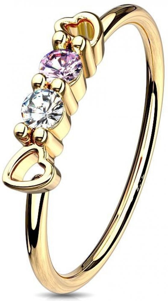Piercing do nosu kroužek.Piercing do nosu kroužek se zirkony čiré a růžové barvy a ozdobými srdíčky.Kroužek je vyroben z chirurgické oceli 316L a ozdobná část z nezávadné bižuterie se rhodiovanou povrchovou úpravou.Uváděný rozměr kroužku je měřen vždy uvnitř. Např. rozměr 0,8 x8 mm znamená, že tloušťka kruhu je 0,8 mm a vnitřní průměr kruhu 8 mm.