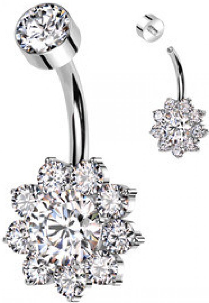 Titanový piercing do pupíku s ozdobnou částí v podobě kytičky dekorované kubickými zirkony čiré barvy