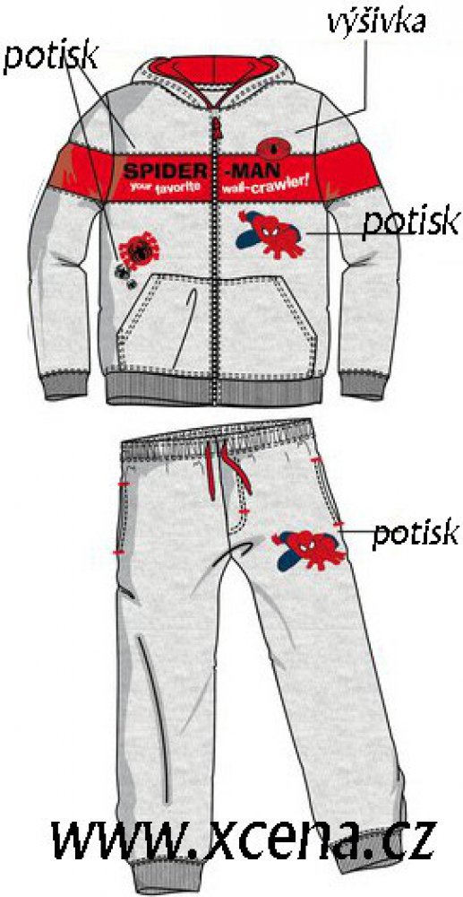Pěkná sportovní souprava s motivem Spidermana pro chlapce od dvou do šesti roků. Souprava je vyrobena z 35% bavlny a 65% polyesteru. Gramáž soupravy je 260g/m2 Mikina je s kapucí a klokanní kapsou. Tepláky mají po stranách kapsy, v pase mají šňůrku. Nohavice mají náplety.