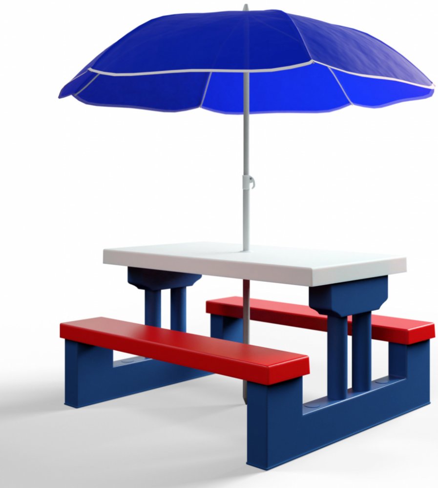 Zábavná sada dětských sedadel pro vnitřní i venkovní použití se skládá ze stolu se dvěma pevně spojenými lavicemi a velkým slunečníkem ze 100% polyesteru. Dostatečná ochrana před sluncem je tak zajištěna i při hraní na zahradě nebo na terase.