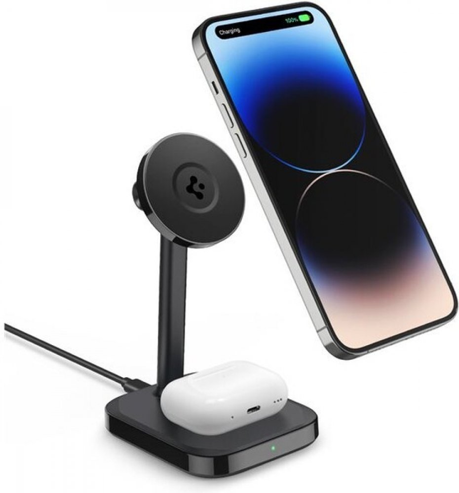 Spigen ArcField MagFit Dual bezdrátová nabíječka (MagSafe/iPhone/AirPods 7.5W/5W), černá, kompatibilní s pouzdrem a příslušenstvím MagSafe. Max. 7,5 W pro váš iPhone a max. 5 W pro vaše AirPods. Nemusíte se namáhat s hledáním vhodného místa - bezproblémově zarovnaný magnet zajišťuje stabilní nabíjení v jakékoli pozici. Technologie Airboost automaticky rozpozná optimalizovaný režim nabíjení. Technologie ochrany proti přehřátí umožňuje optimalizované řízení teploty a vyšší výkon.