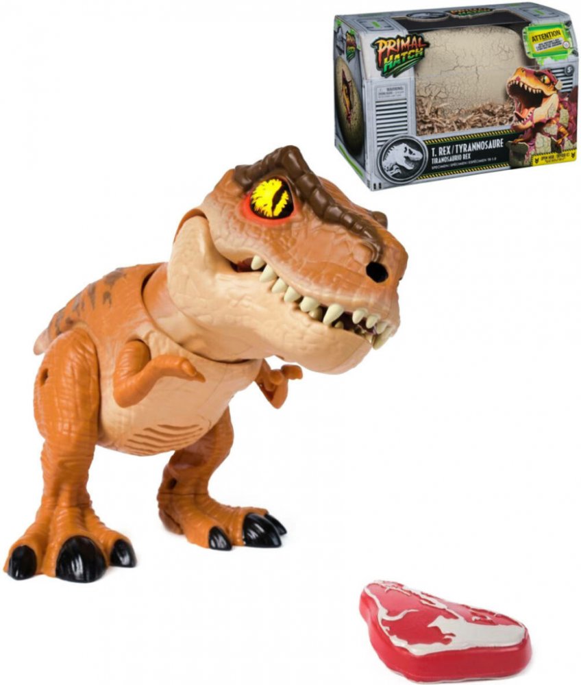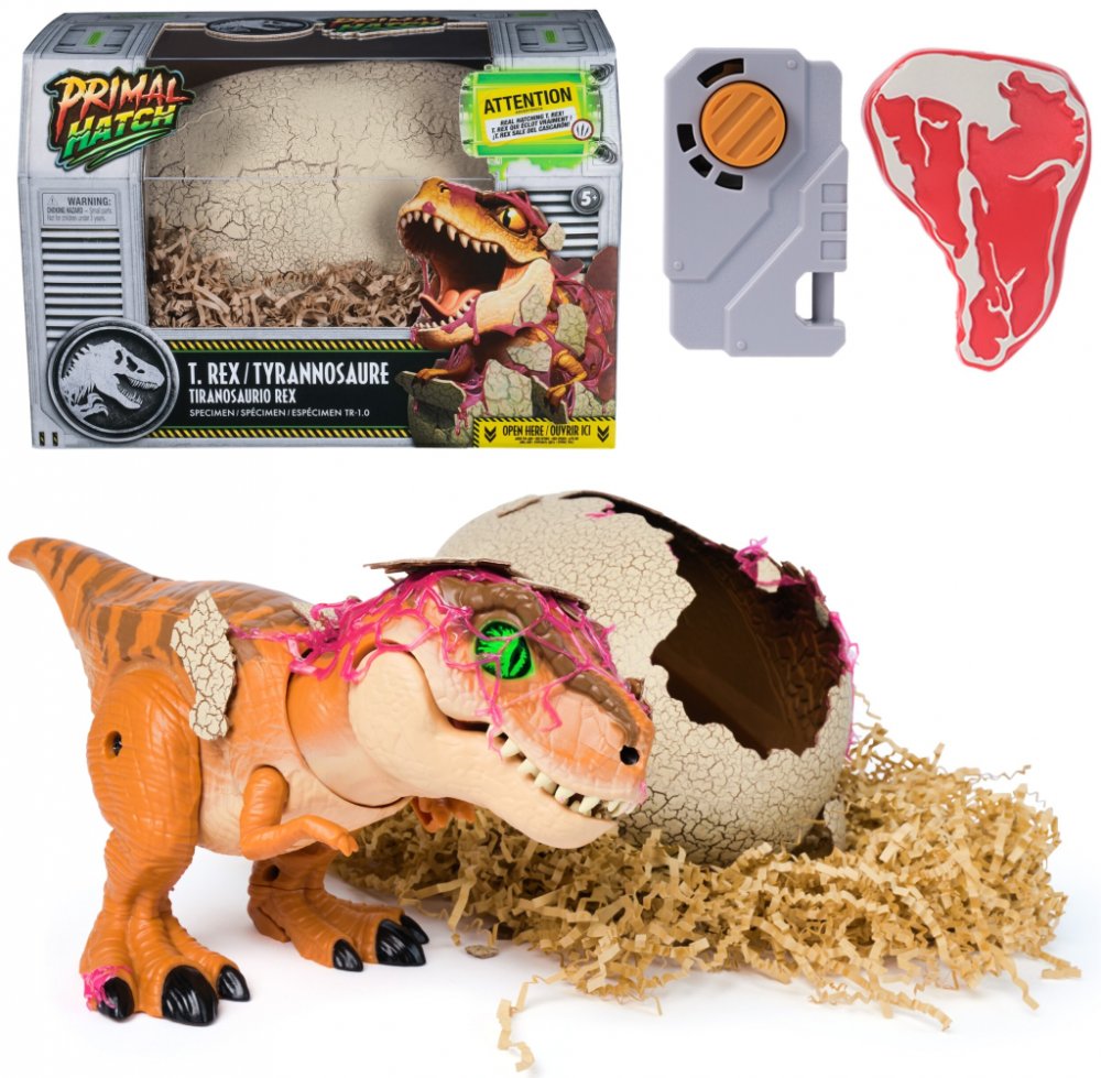 Nejprve vylíhněte T-Rexe opakovaným klepáním na vejce a poté s úžasem sledujte, jak vejce začne praskat a vaše dinosauří mládě se vynoří z lepkavé membrány svého vejce. T-Rex stane přítelem, nebo nepřítelem! Ať už se jedná o péči o srst, trénink, škádlení nebo jen hraní – Primal Hatch T-Rex je ideální hračka pro malé průzkumníky a velké fanoušky dinosaurů od 5 let.