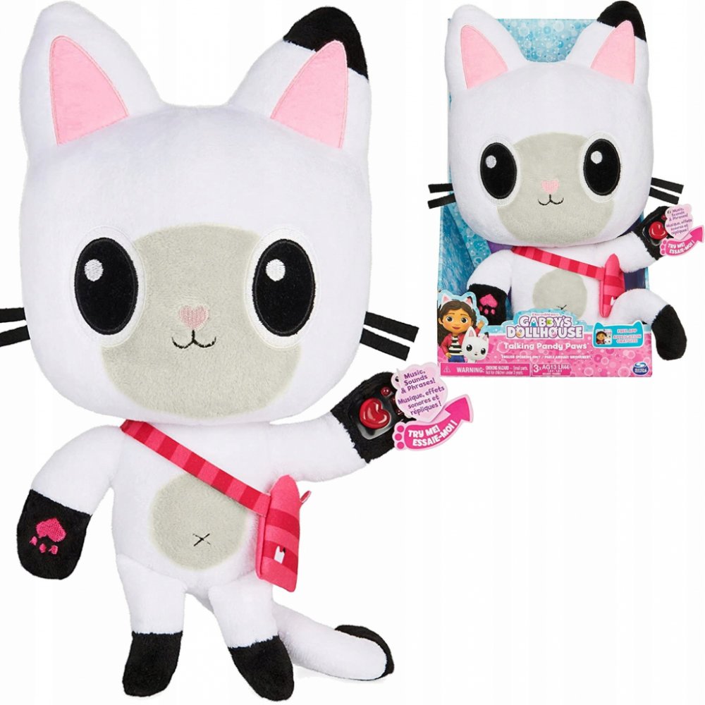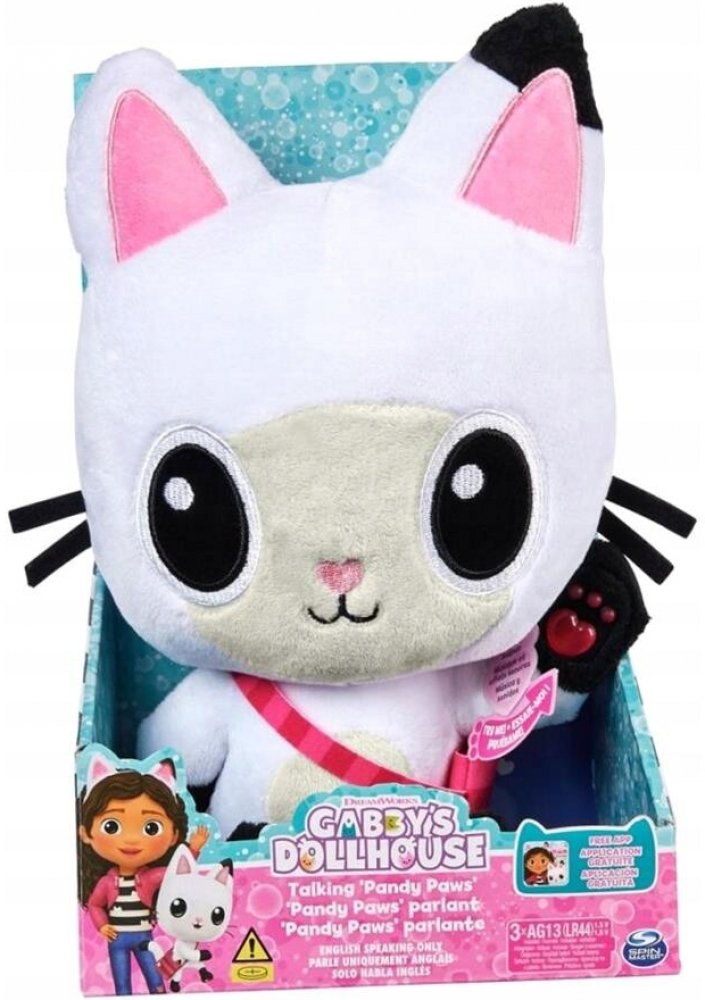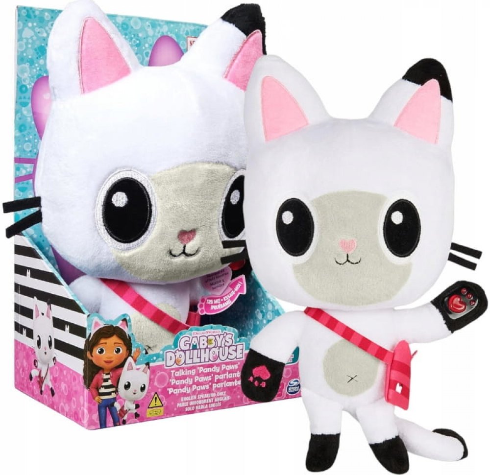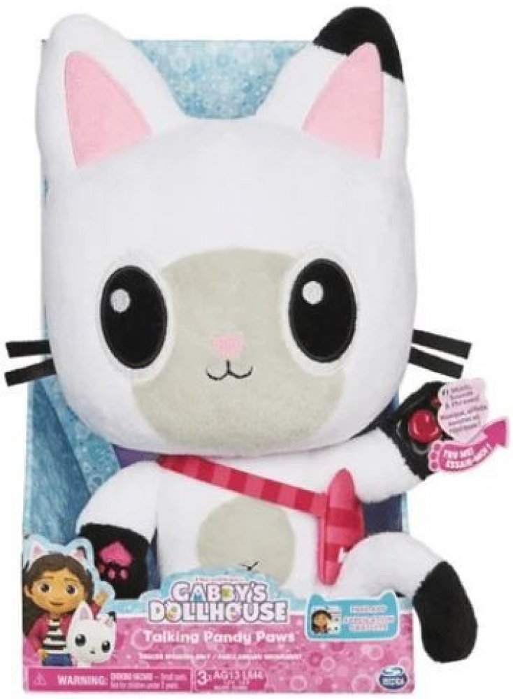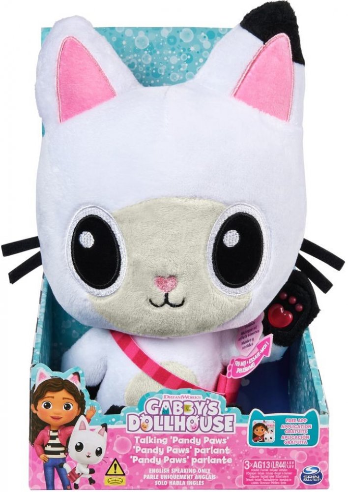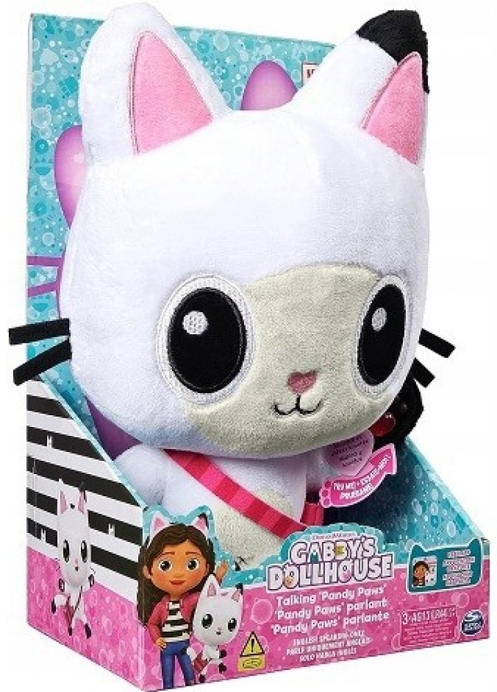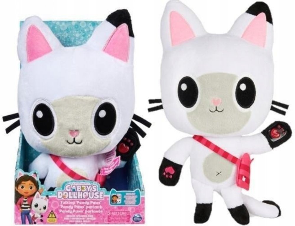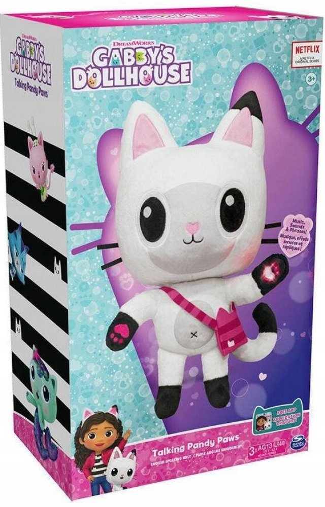 Připravte se na pořádné objetí s mluvícím Pandym z Gábinina kouzelného domku. Tento 33 cm vysoký super měkký a přítulný plyšák Gábinina nejlepšího kočičího kamaráda přichází ze seriálu přímo k vám. Se špičatýma ušima, rozkošným ocáskem, vyšívanými detaily a taštičkou je dokonalým kamarádem na hraní i na spaní. Zmáčkněte mu tlapku a podržte, aby se rozsvítila a začala hrát písničku. Krátce zmáčkněte, tlapka se rozsvítí a uslyšíte ještě víc zvuků a hlášek ze svého oblíbeného seriálu. Mluvící Pandy umí dvě písničky a přes 10 zvuků. Se svým novým plyšákem Pandym můžete zažívat spoustu dobrodružství. Pokud se chcete ještě víc pomazlit, pořiďte si plyšáky Purr-ific (prodávají se zvlášť). Obejměte svého vlastního Pandyho s Gabby’s Dollhouse Talking Pandy Paws. Pandy mluví pouze ANGLICKY.