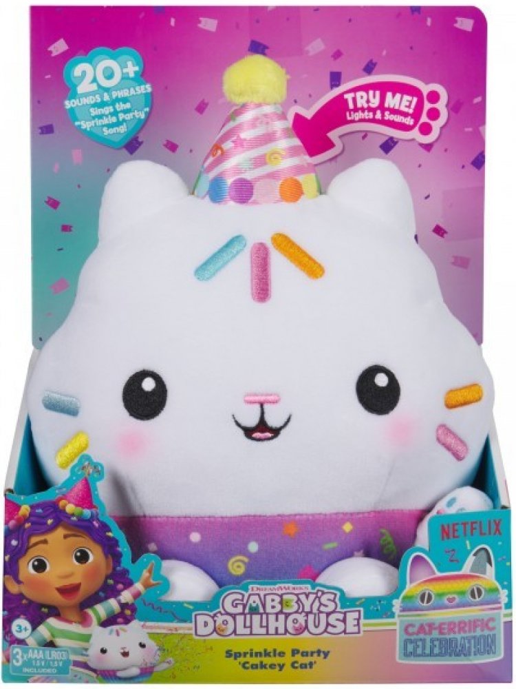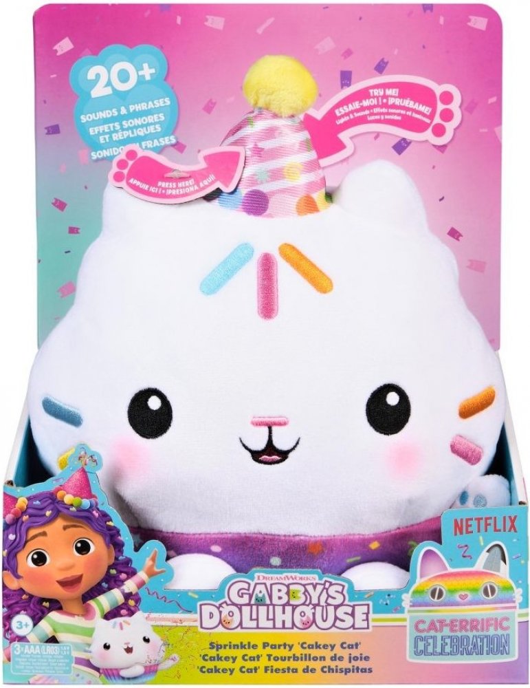 S plyšovou hračkou Dortě můžete zažívat nezapomenutelná herní dobrodružství z kouzelného domku! Tato interaktivní plyšová hračka kočičky Dortě je oblečena ve svém exkluzivním oblečení s motivem oslav! Otočte Dortě vzhůru nohama, abyste vstoupili do ztřeštěného režimu, zatřeste s ním, abyste vstoupili do párty režimu, a stiskněte tlačítko na jeho party klobouku, abyste aktivovali režim mluvení!