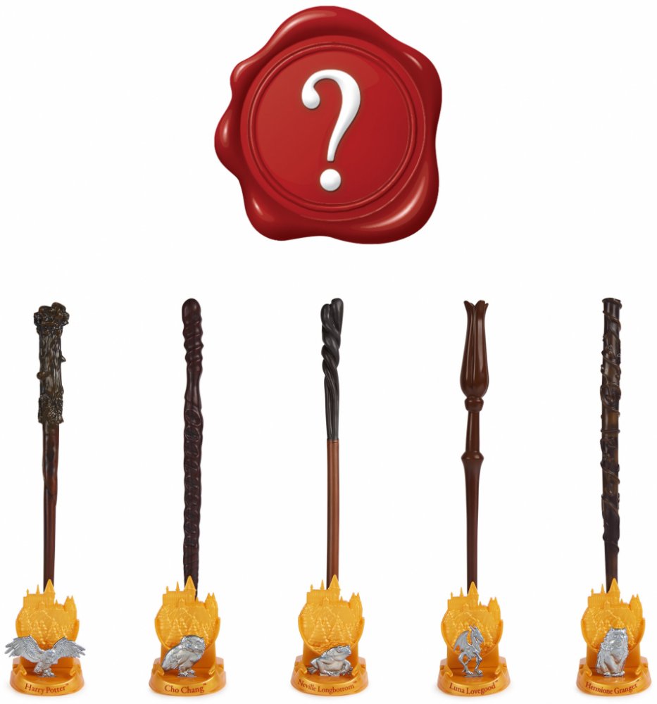 Uvnitř neprůhledné krabičky je jako překvapení schovaná 30 cm hůlka s kovově zlatým podstavcem se znakem Bradavic a kovovým zvířátkem, které patří danému čarodějovi.