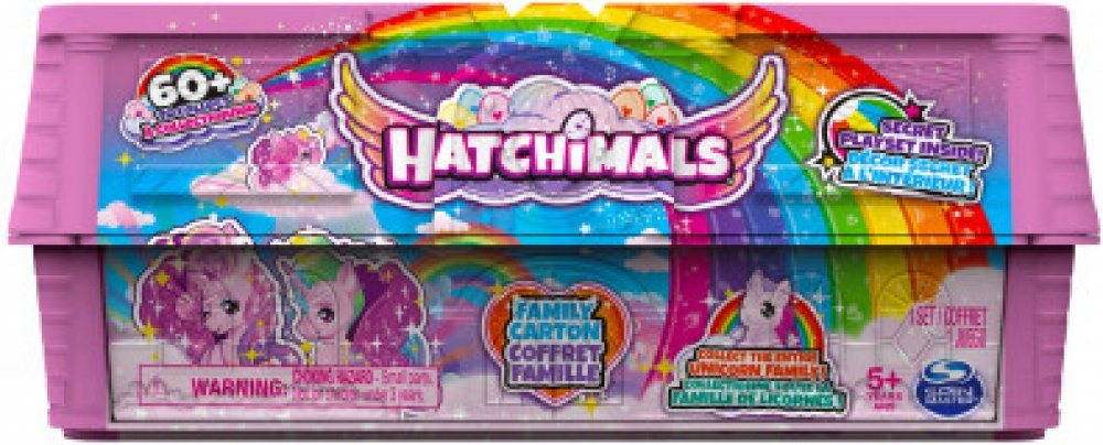 Spin Master Hatchimals - Rodinné balení v kartonu kočičky. Objevte 2 rodiče, 1 velké dítě a příslušenství. Vylíhněte 3 malé děti a 4 sladká miminka. Složte přední část balení, nastavte si tématické pozadí a uspořádejte uspořádejte taneční párty. Obsahuje: 10 Hatchimals CollEGGtibles 2 doplňky 1 grafická vložka 1 sběratelský