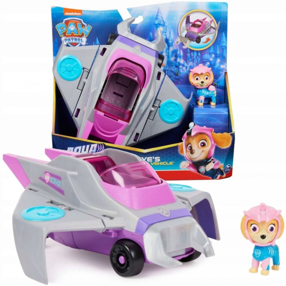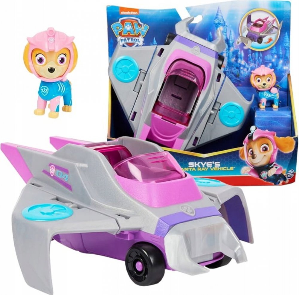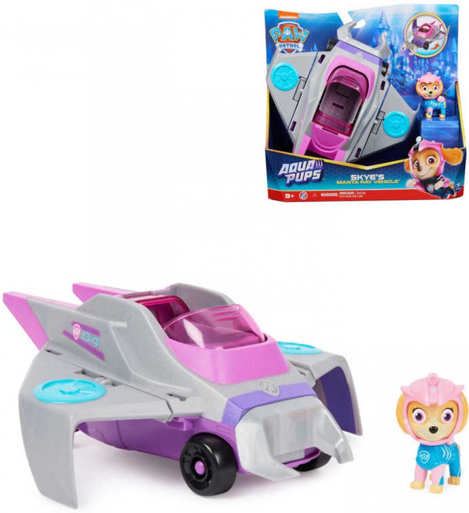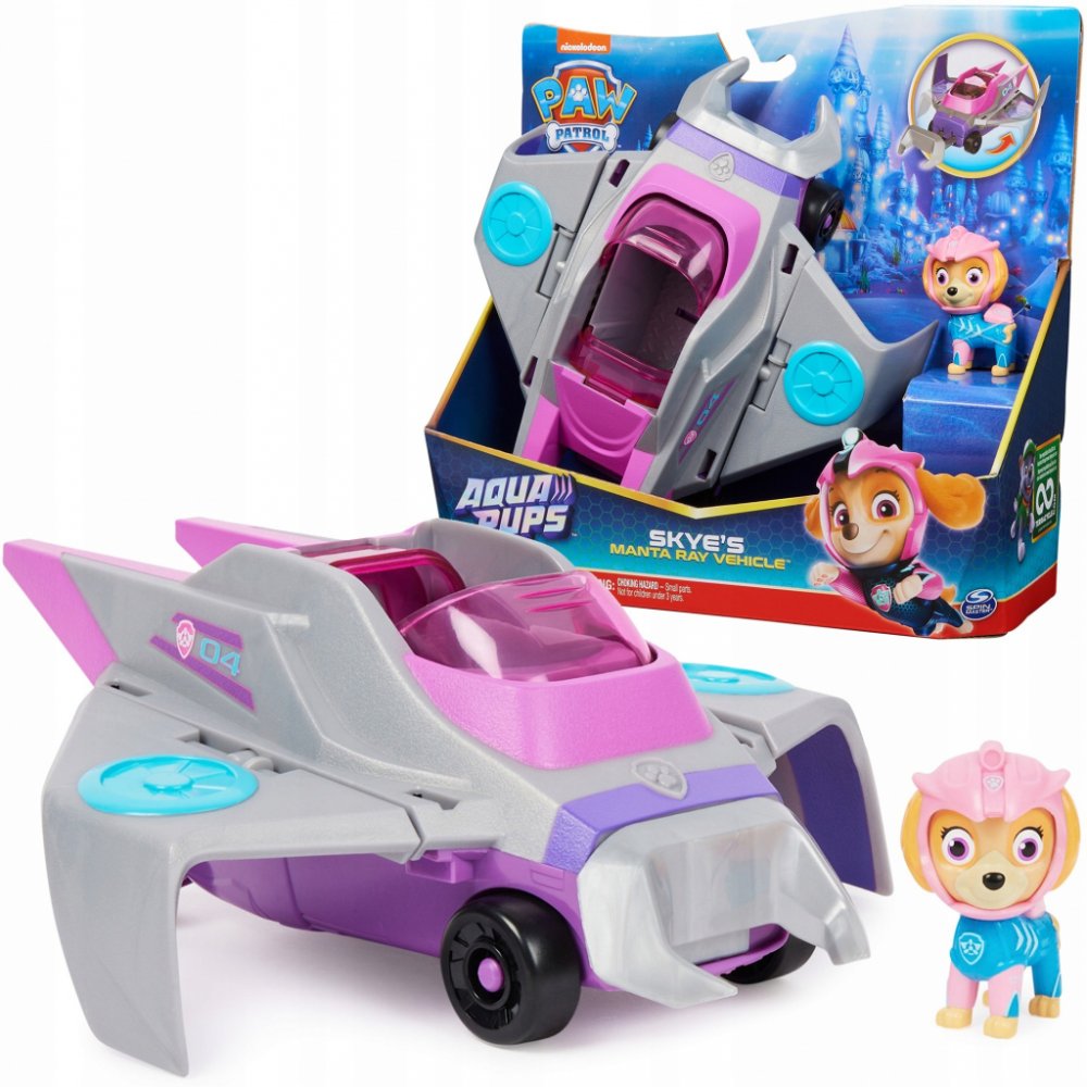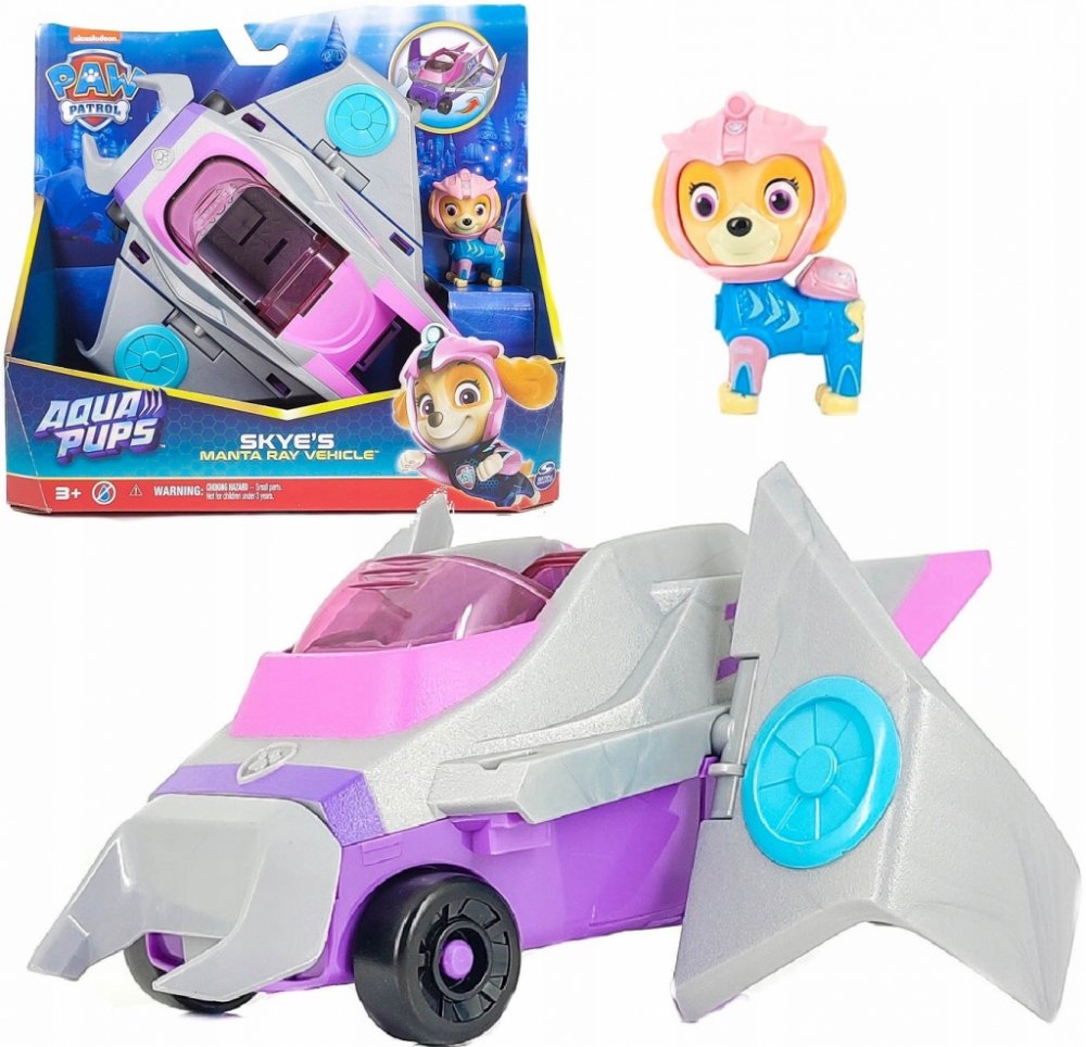PAW Patrol ? Aqua Pups ? Deluxe Vehicle ? Skye Vydejte se na další záchrannou misi se Skye. Skye je vybavena růžovým potápěčským oblečkem Aqua Pups, helmou a batohem a je připravena na vzrušující fantasy mise na širém moři. Funkční záchranný nástroj: Když je čas na záchrannou misi, posaď Skye do kokpitu a posuň střechu vozidla, aby se aktivovala křídla a klakson. Pro děti od 3 let Skye v mantím zá...