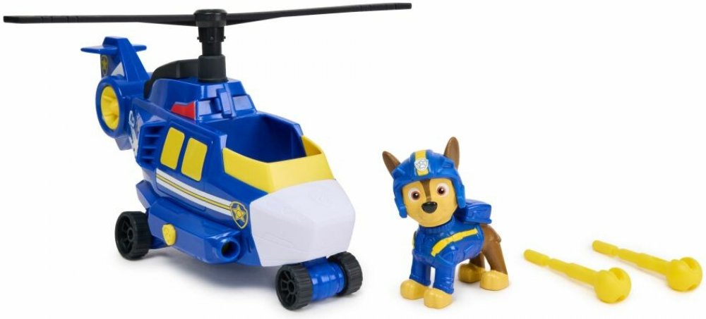 Leťte do akce s Chasem z Tlapkové patroly Air Rescue a jeho policejní helikoptérou! Když je čas na akcí nabitou záchranu, upevněte Chaseovy nohy do správné pozice v kokpitu a otočte vrtulemi, než se vydáte na misi! Nabijte dělo jednou ze dvou záchranných střel, které jsou součástí balení, a pak je stisknutím Tlapkového odznaku na vrtulníku vystřelte a zachraňte situaci! Chase měří přes 5cm a je oblečen ve své modré letecké záchranné bundě a helmě! Pro ještě zajímavější způsoby hry hledejte Marshalla v jeho hrdinském hydroplánu a Skye s jejím hrdinským tryskáčem, abyste sestavili dokonalý záchranný tým!