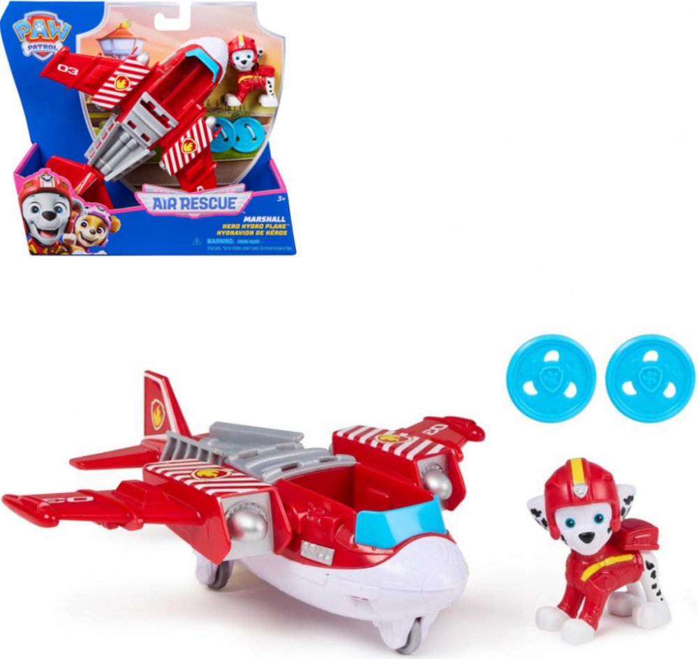 Leťte do akce s Marshallem z Tlapkové patroly Air Rescue a jeho hasičským záchranným hydroplánem! Když je čas na akci nabitou záchranu, upevněte Marshallovy nohy do správné pozice v kokpitu a otočte vrtulemi, než se vydáte na misi! Nabij kanón jednou ze dvou diskových střel, které jsou součástí balení, a pak stiskni páčku na ocasu letadla, abys je vystřelil a zachránil situaci! Marshall měří přes 5 cm a je oblečen v jeho červené letecké záchranné bundě a helmě! Pro ještě zajímavější způsoby hraní hledejte Chase v jeho hrdinské helikoptéře a Skye s jejím hrdinským tryskáčem, abyste sestavili dokonalý záchranný tým!