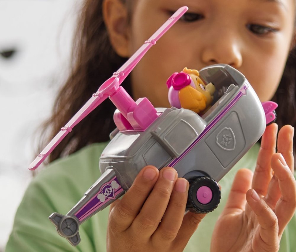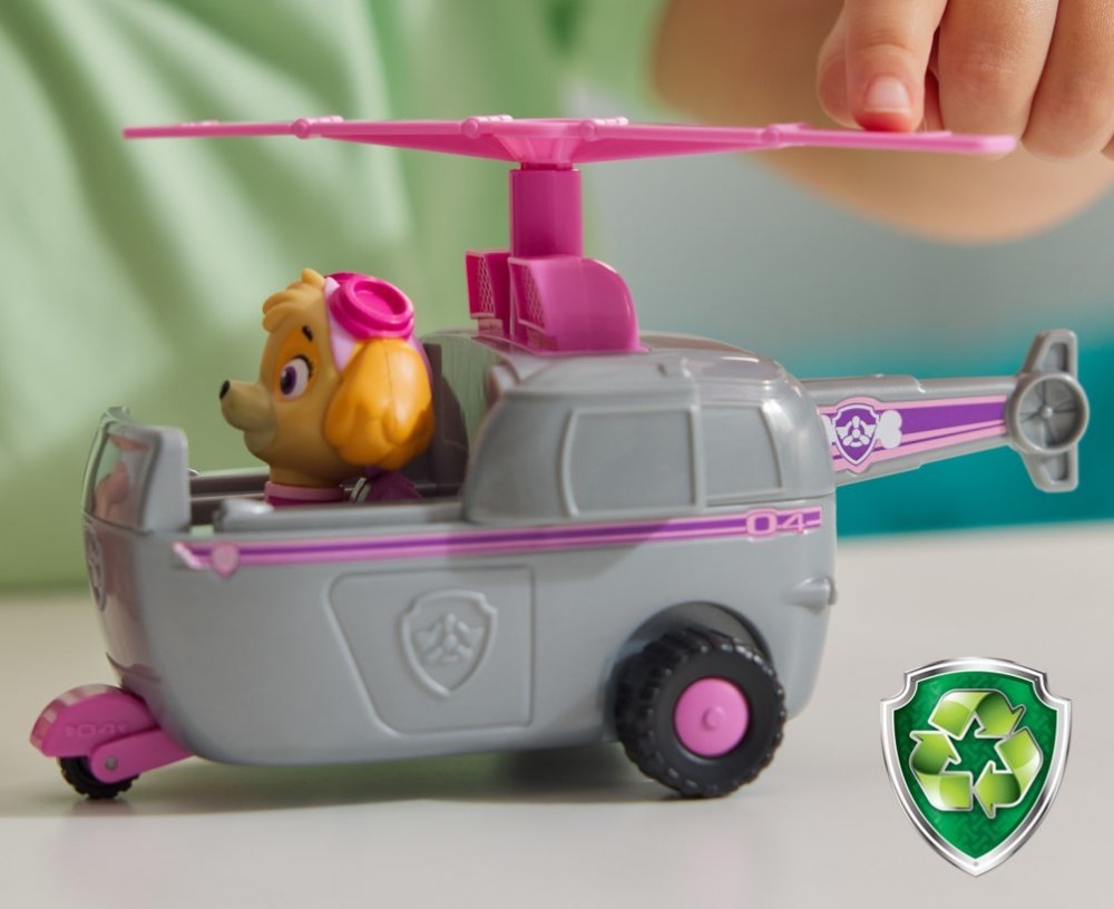 Sada obsahuje vrtulník a figurku znázorňující psa Skye. Figurka je věrnou kopií filmové postavy, oblečená do růžového hrnečku a batohu, s růžovým pilotem s brýlemi na hlavě. Figurka má pohyblivou hlavu. Helicopter je v metalické šedé barvě s růžovými a fialovými prvky. Má tři pohyblivá kola, takže se může snadno pohybovat po rovném povrchu, a otáčecí vrtuli.