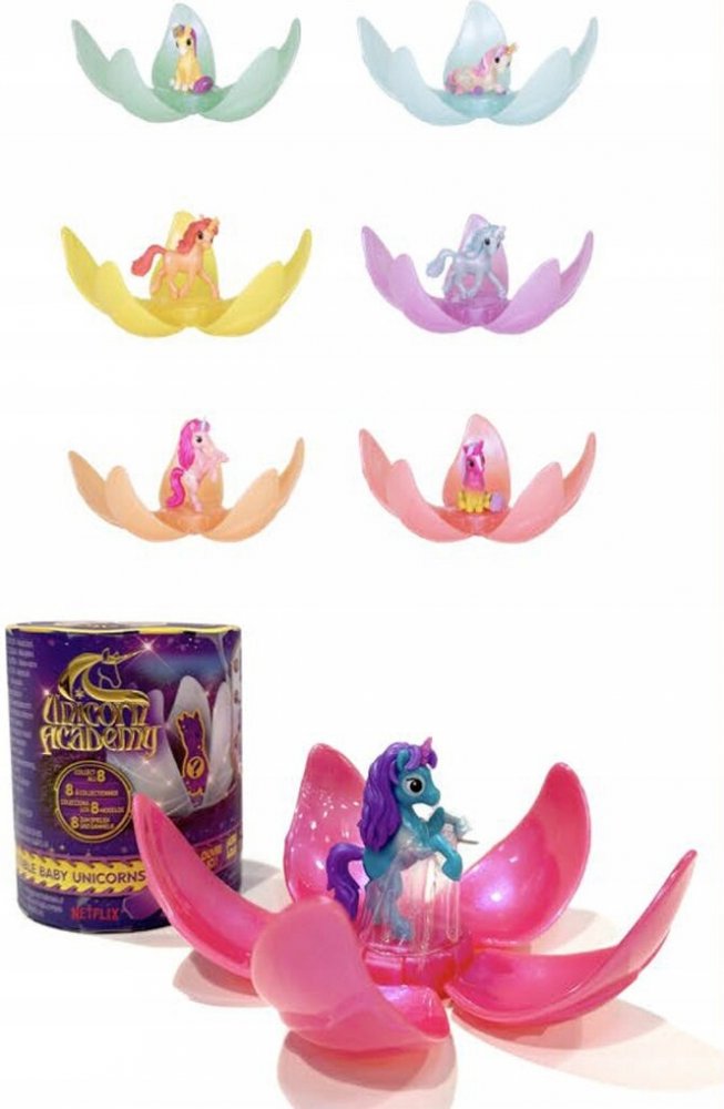 Zatáhněte za poutko a začněte rozbalovat svého jednorožce – po odstranění horní části obalu se rozevřou perleťové okvětní lístky a odhalí vaši figurku! Kterého sběratelského jednorožce najdete? Posbírejte malého Lístka, Uhlíka, vzácnou Hvězdu a další (prodávají se zvlášť)! Pohrajte si s novou figurkou a poté si ji vystavte uvnitř třpytivého květu.
