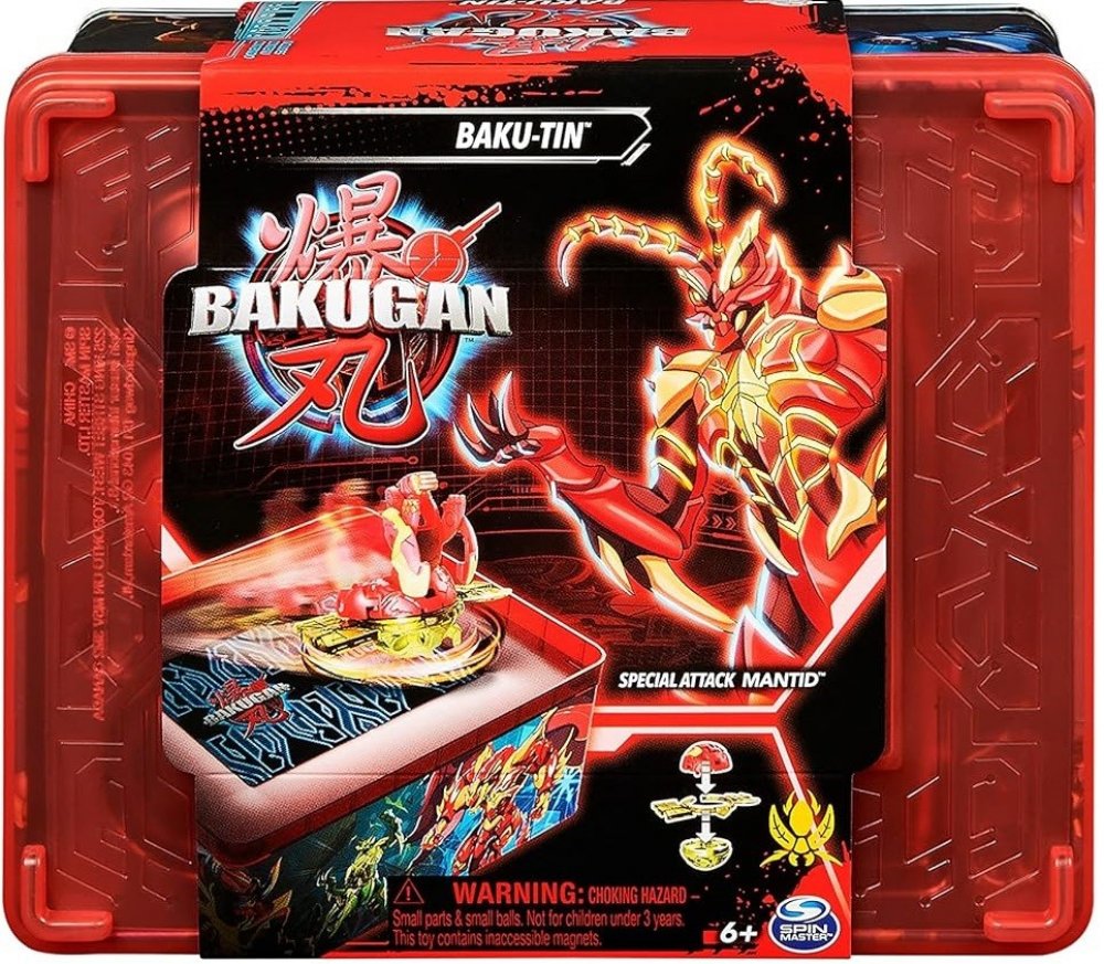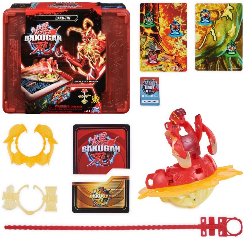 Uložte si sbírku Bakuganů do Baku-tinu, abyste mohli kdykoliv bojovat ve velkém stylu. Na tomto prémiovém kufříku na Bakugany jsou úžasné kresby Bakuganů a patří k němu Mantid Bakugan se speciálním útokem. Tato sada obsahuje také sběratelské karty, například karty postavy, speciálního útoku a brány, spolu s tažným lanem XL, se kterým můžete vyrazit do bitvy se svými oblíbenými bojovníky Bakugan. Když Baku-tin otevřete, získáte dvě vrstvy úložného prostoru pro Bakugany, sběratelské karty a kruhy na speciální útoky, které jsou snadno přístupné a ideální na cesty. Odklopením a překlopením víka si vytvoříte vlastní bitevní prostor, kde můžete kdykoli bojovat. Každá akční figurka Bakugan obsahuje speciální kód, který lze použít v online hře Roblox pro nové způsoby hraní a interakce. Vylepšete si herní strategii pomocí balíčků Bojová aréna a Trénovací balíček (každý se prodává samostatně). Přidejte všechny zbrusu nové hračky Bakugan včetně bitevních a startovních balíčků (každý se prodává samostatně) mezi své oblíbené sběratelské předměty a sestavte si elitní tým. Díky Baku-tinu si domů přinesete dokonalé úložiště hraček pro svou sbírku Bakuganů.
