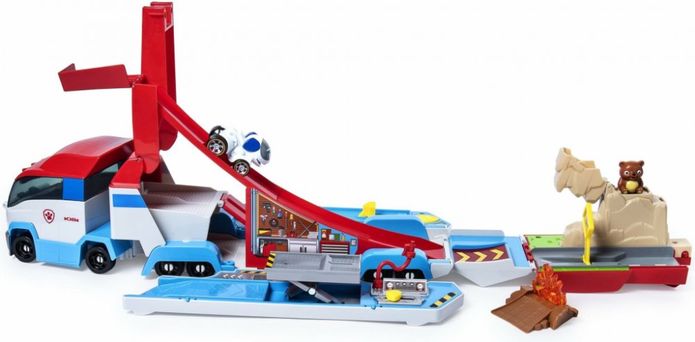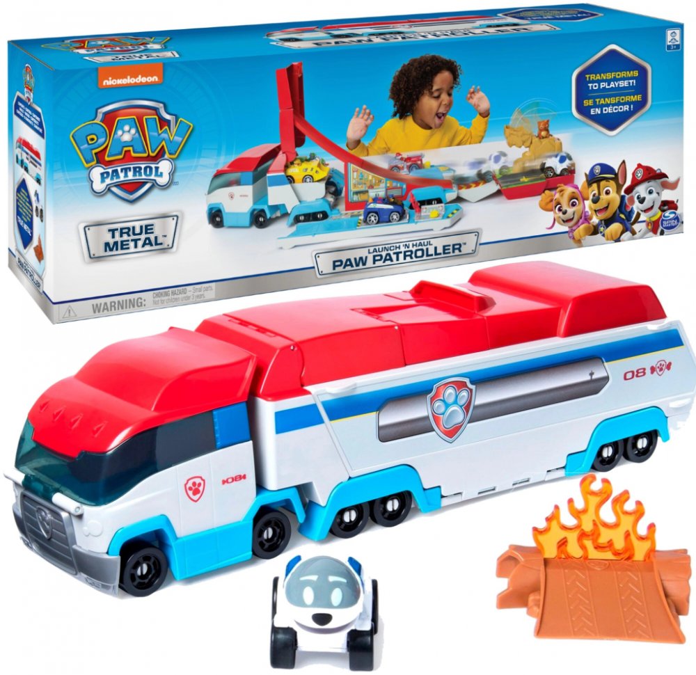 Velký transformující se truck z edice PAW Patrol od Spin Master se během chvilky změní v akční herní stanici s rampou. Nabízí vystřelovač autíček, 12 kol pro stabilní jízdu, záchranné mise jako hašení požáru, zvedací plošinu a záchranu medvěda. Pojme až 7 kovových autíček (True Metal, prodávají se zvlášť) a obsahuje Robopsa pro okamžitou hru.