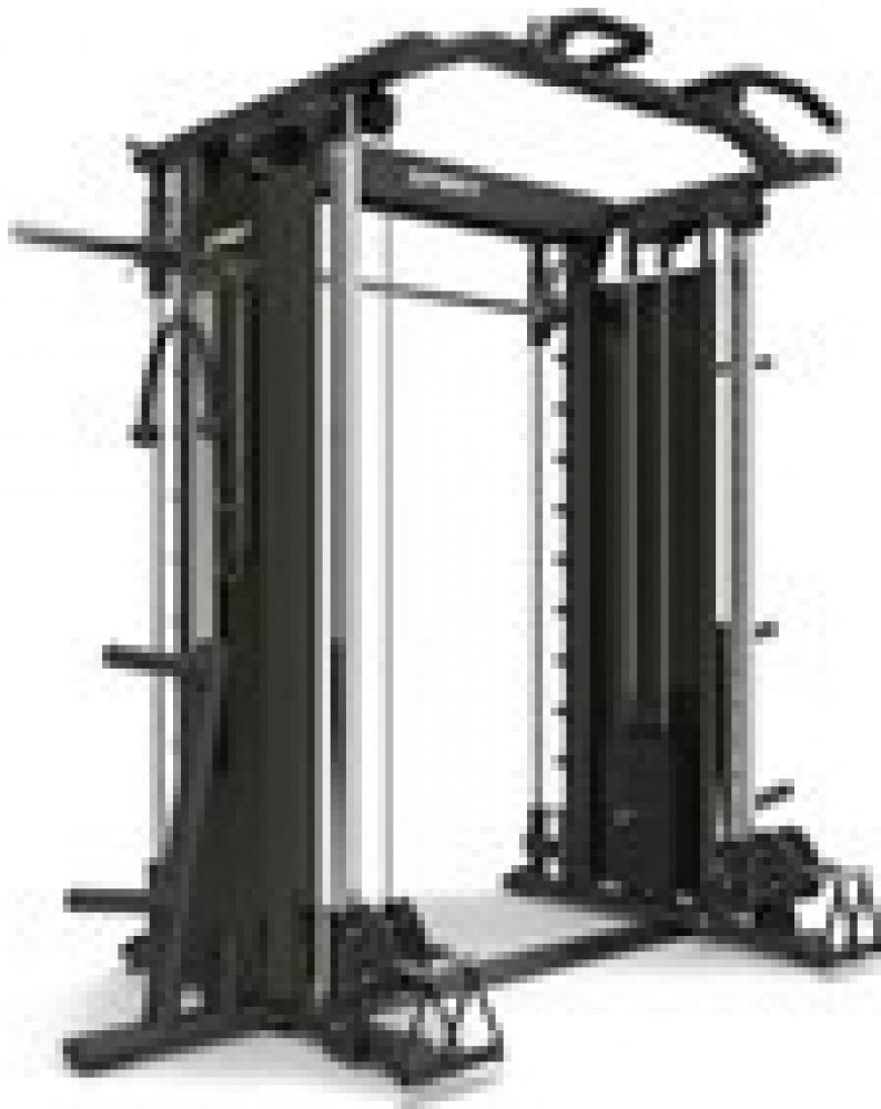 Všestranný trenažér spojuje Smithův stroj a DAP s dvojitou kladkou do jednoho funkčního multifunkčního trenažéru.
