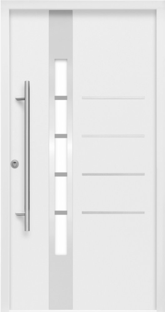 Splendoor bezpečnostní vchodové dveře ThermoSpace Berlin RC2 v bílé barvě zajišťují spolehlivou ochranu a vysokou kvalitu bydlení. Nerezové a skleněné prvky vytvářejí stylové akcenty a dodávají krásný design. Povrch vchodových dveří je pokryt šedou dekorativní fólií , která zároveň chrání před poškozením. Vchodové dveře s optimální tepelnou izolací Všechny komponenty domovních dveří přispívají k optimální tepelné izolaci. Ocelové dveřní křídlo se stavební hloubkou 67 mm má dvě úrovně těsnění a je vyplněno tuhou PU pěnou. Pro ještě lepší tepelnou izolaci a snížení tepelného úniku je tepelně oddělena i zárubeň a hliníkový práh. V důsledku toho mají vchodové dveře hodnotu tepelné izolace Ud 1,3 W/m2K. Také trojité zasklení ISO snižuje náklady na vytápění, přičemž má vysokou hodnotou tepelné izolace Ug 0,9 W/m2K a lépe propouští přirozené světlo díky vyššímu stupni propustnosti světla. Bezpečné vchodové dveře s třídou odolnosti RC2 pro bezpečný domov Dveře s třídou odolnosti RC2 se vyznačují tím, že v celkové konstrukci nemají žádná slabá místa. Váš domov je tak optimálně zabezpečen. Vchodové dveře Berlin RC2 jsou vybaveny 5-ti bodovým uzamykacím systémem. Nad a pod hlavním zámkem jsou dva otočné háky. Na straně pantů jsou navíc zpracovány čtyři masivní kyvné čepy, tři stabilní a prostorově nastavitelné panty s krytkami a třemi svorníky. Moderní vchodové dveře s nerezovým kováním Dveře jsou vybaveny madlem z nerezové oceli (délka 100 cm), vnitřní klikou, nerezovou rozetou a bezpečnostní profilovou cylindrickou vložkou třídy B se 3 klíči. Rozeta má ochranu proti odvrtání a vloupání třídy 3. Ocelová dveřní křídla se vyznačují vysokou pevností, kdy jsou zvláště odolná vůči vloupání, a odolností proti povětrnostním vlivům a průvanu. Vnější rozměry rámu (V x Š): 210 cm x 100 cm Celková stavební hloubka: 70 mm