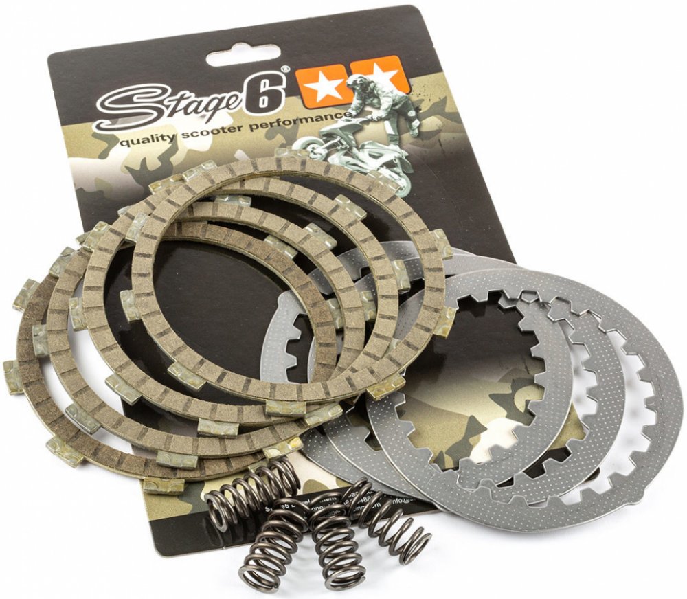 Karbonové závodní spojkové lamely, od Stage6, téměř zcela zabraňují prokluzování spojky i při nejvyšších otáčkách motoru. U vyladěných motorů často prokluzují spojkové lamely kvůli nízkému napětí pružin a jejich materiálu. Sada obsahuje sadu spojkových pružin, sadu kovových mezilamel a sadu spojkových lamel.