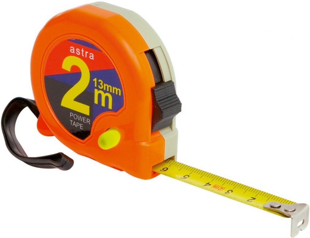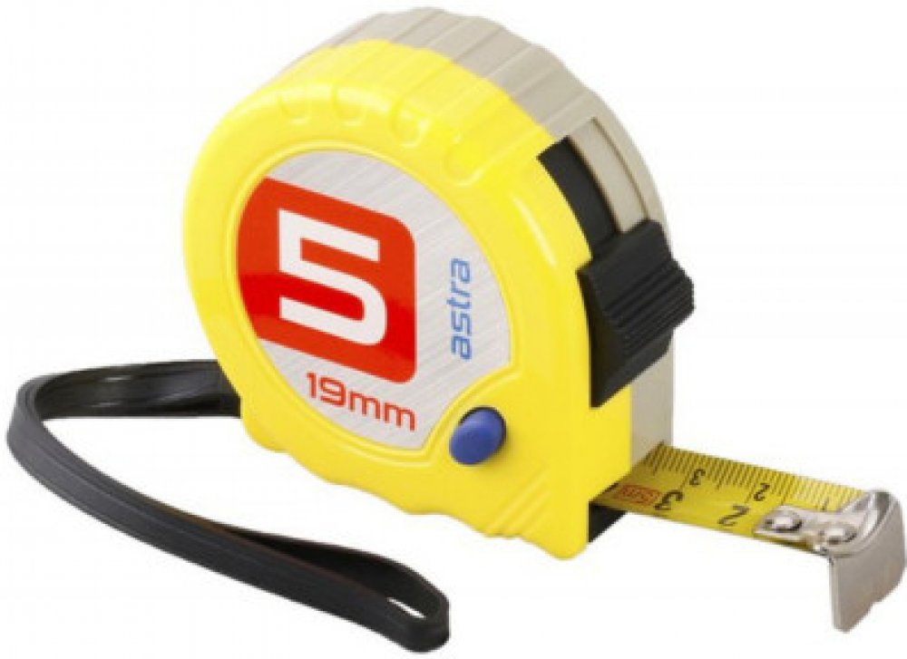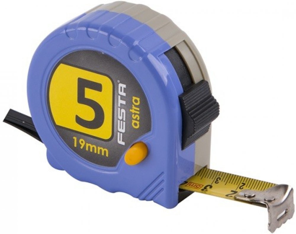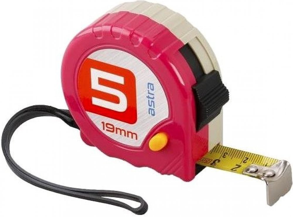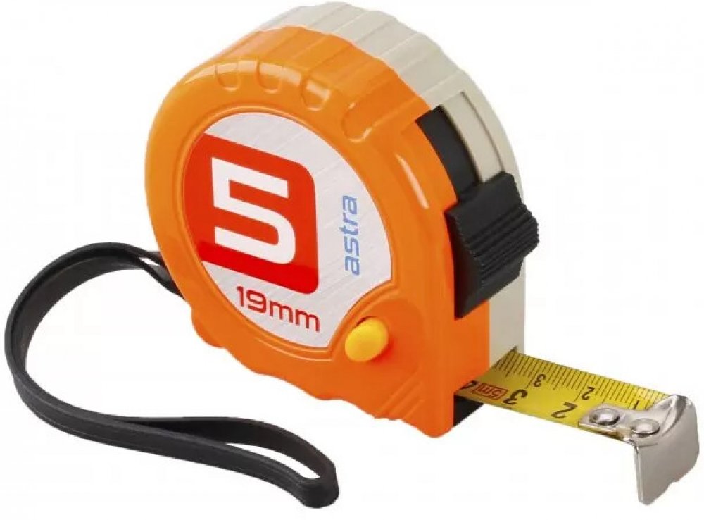 Kvalitní svinovací metr ASTRA s kalenou páskou a dobře čitelnou stupnicí. Plastové tělo je vybaveno kovovou pžezkou pro uchycení na opasek či okraj kapsy a poutkem pro navlečení na ruku. Metr má dvě pojistky pro aretaci pásky při vysunutí, klasickou ve formě posuvného tlačítka a dočasnou blokaci pouze pro dobu přidržení tlačítka na boku těla metru.