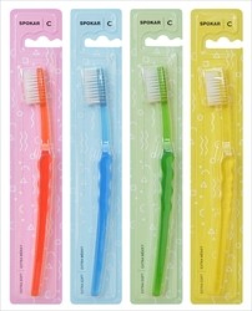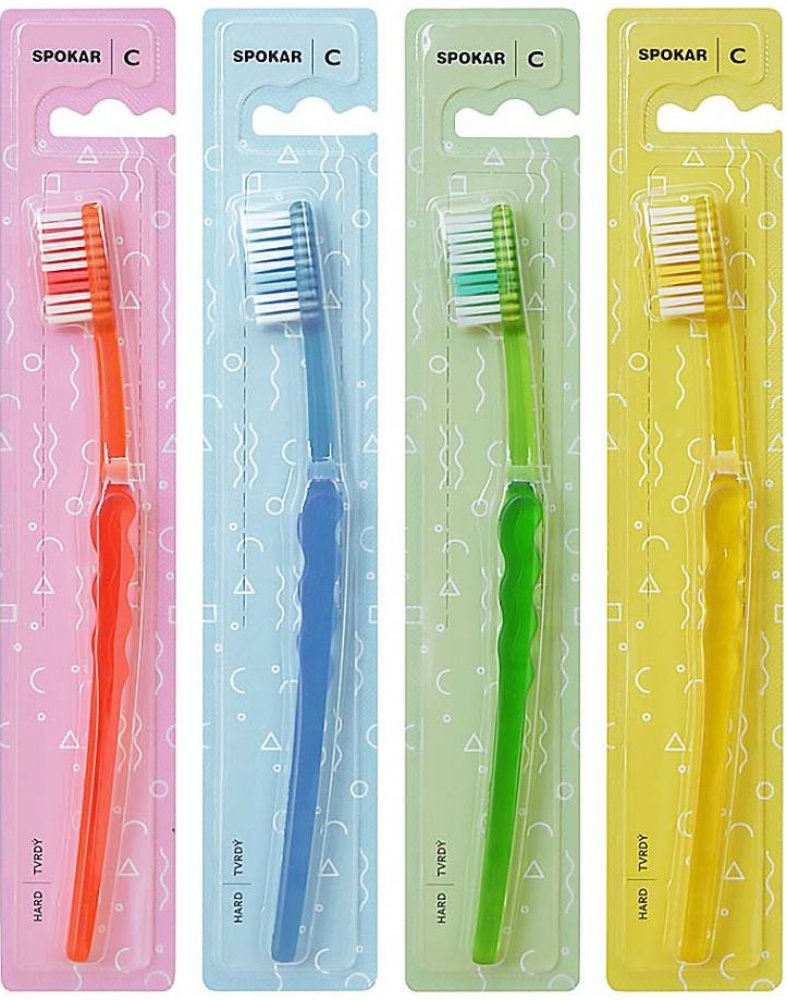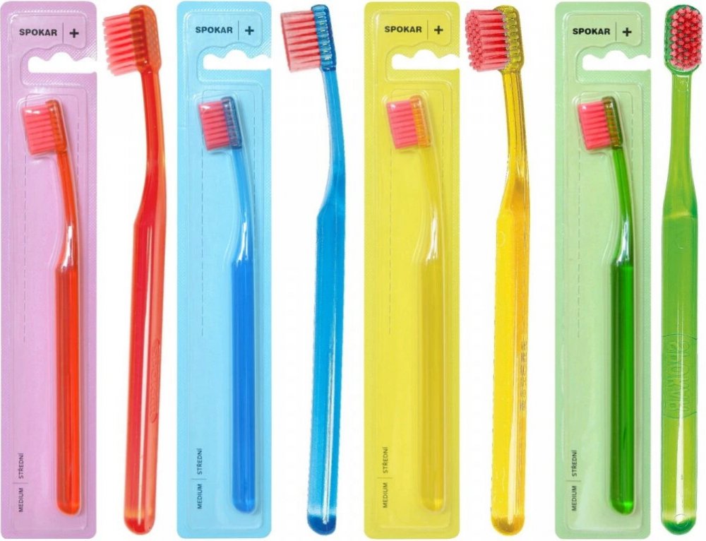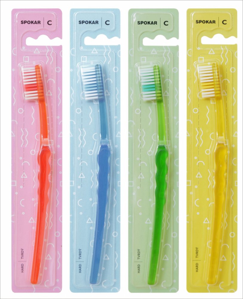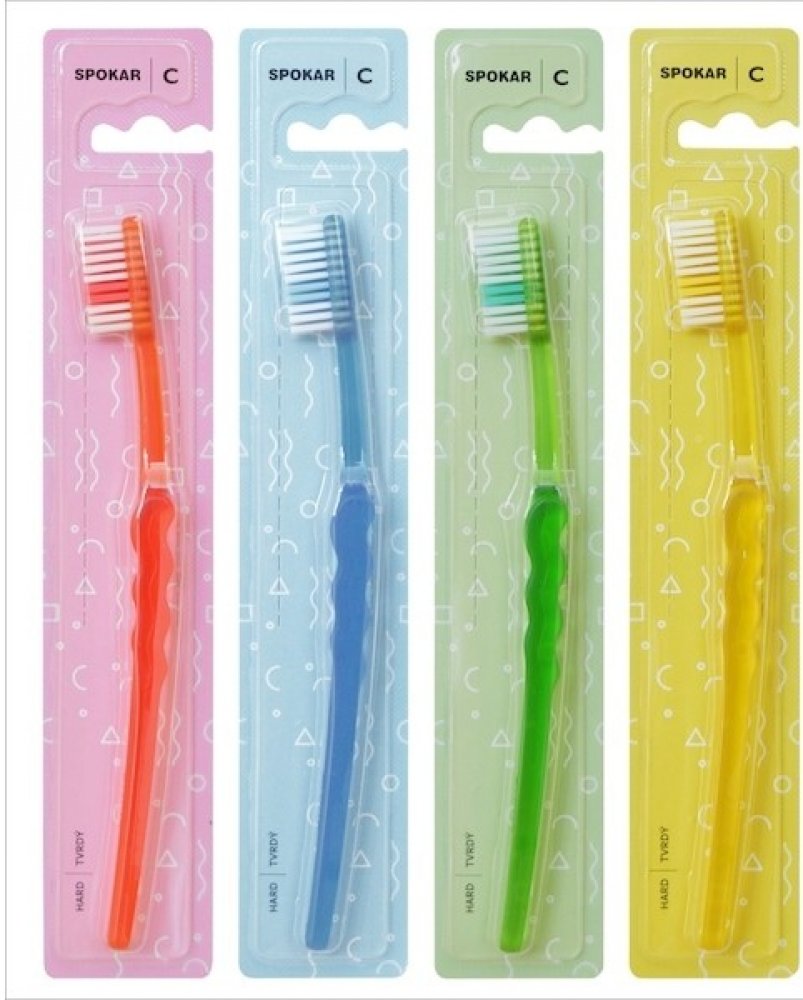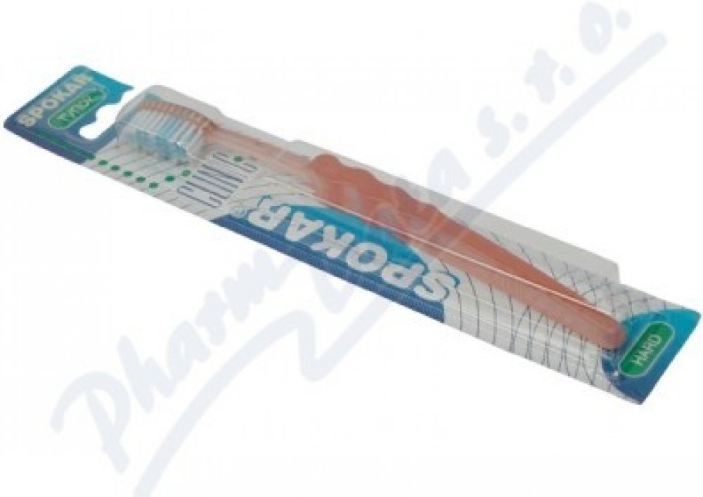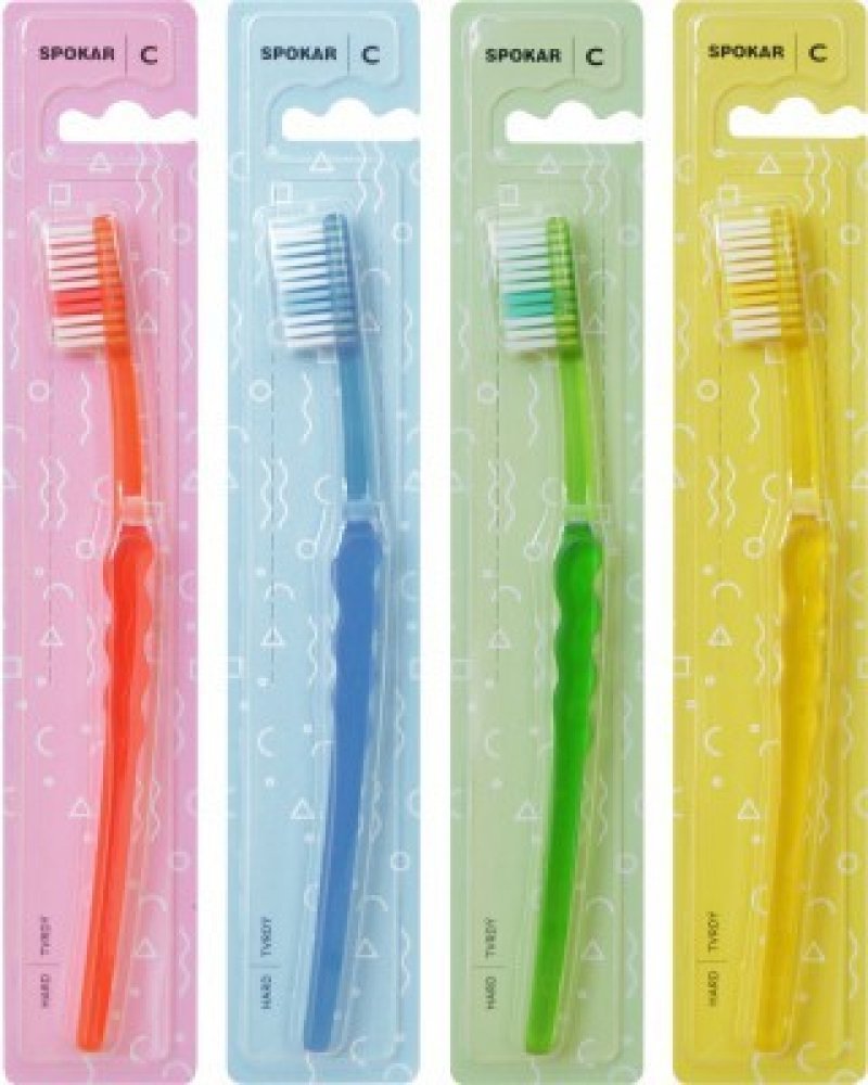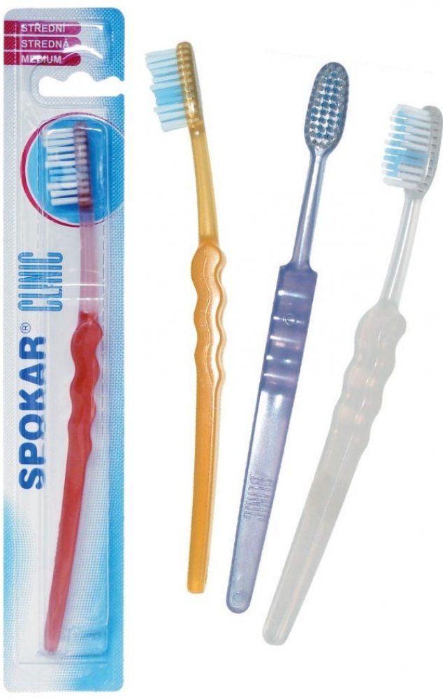 Spokar 3416 Clinic zubní kartáček má široce stupňovité zastřižení vláken, ergonomicky tvarované držadlo. Vlákna tynex. Tvrdost vláken měkký. Větší hlava je osazena vlákny s rovným zástřihem. Prohnuté držadlo se zvlněnou střední částí umožňuje snadné držení, přesnou kontrolu kartáčku při čištění a dobrý dosah ke všem zubům.