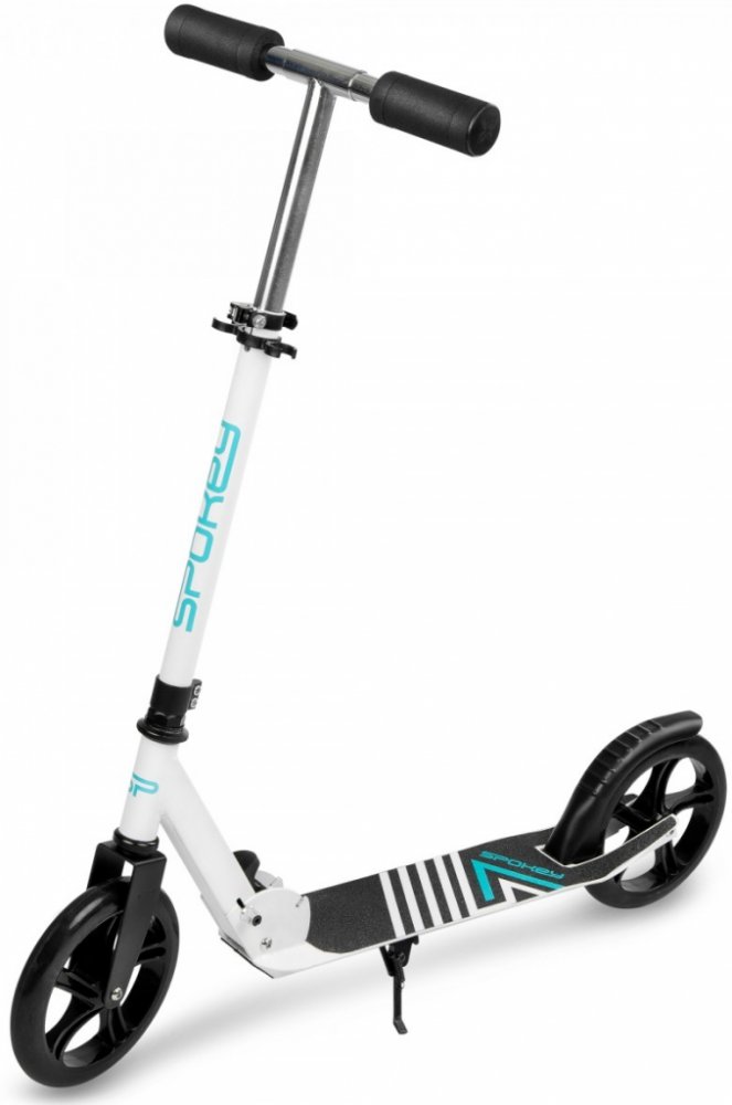 Koloběžka Spokey AYAS je vybavená nožní brzdou, která vám umožní přizpůsobit rychlost jízdy a stojánkem, se kterým můžete koloběžku kdekoliv “zaparkovat”.