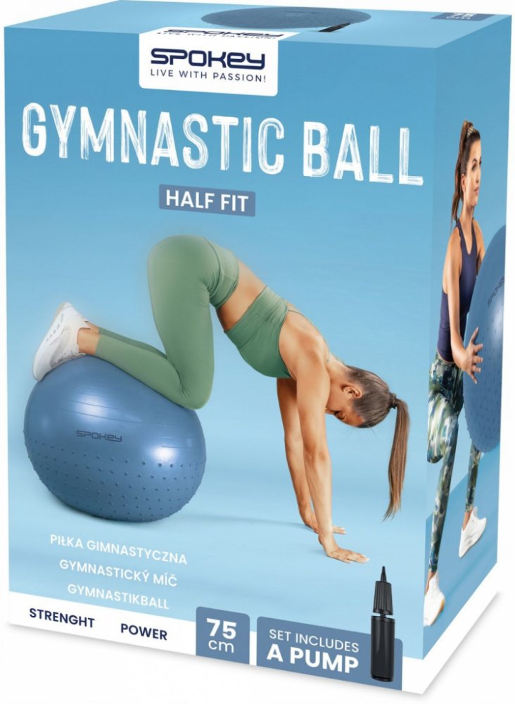 Spokey HALF FIT to je míč, který poskytuje vynikající podporu během různých cvičení. Je také skvělou náhradou klasické židle v kanceláří nebo doma – sezení na míči vyžaduje správné držení těla. Gymnastický míč HALF FIT také rozvíjí rovnováhu. Lze jej využít nejen během cvičení či rehabilitace, ale také jako židli, která uleví páteří během dlouhých hodin strávených v kanceláří nebo doma u počítače. Část míče s masážními výstupky stimuluje krevní oběh už i při malých pohybech.