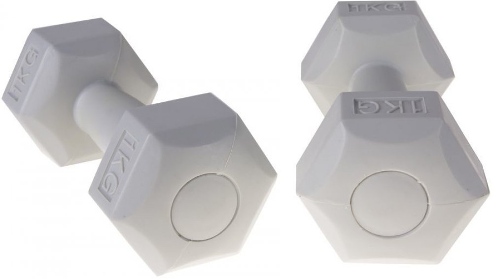 Činky mají klasický tvar, kde místo pro úchop je zúžené.