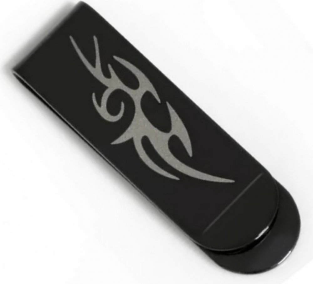 Elegantní spona na bankovky černé barvy s lesklou povrchovou úpravou a s vyobrazeným ornamentem. Spona je vyrobena z chirurgické oceli vysoké kvality, která udržuje svůj lesk a odolává oxidaci a proto je ideálním materiálem právě pro výrobu těchto elegantních doplňků.