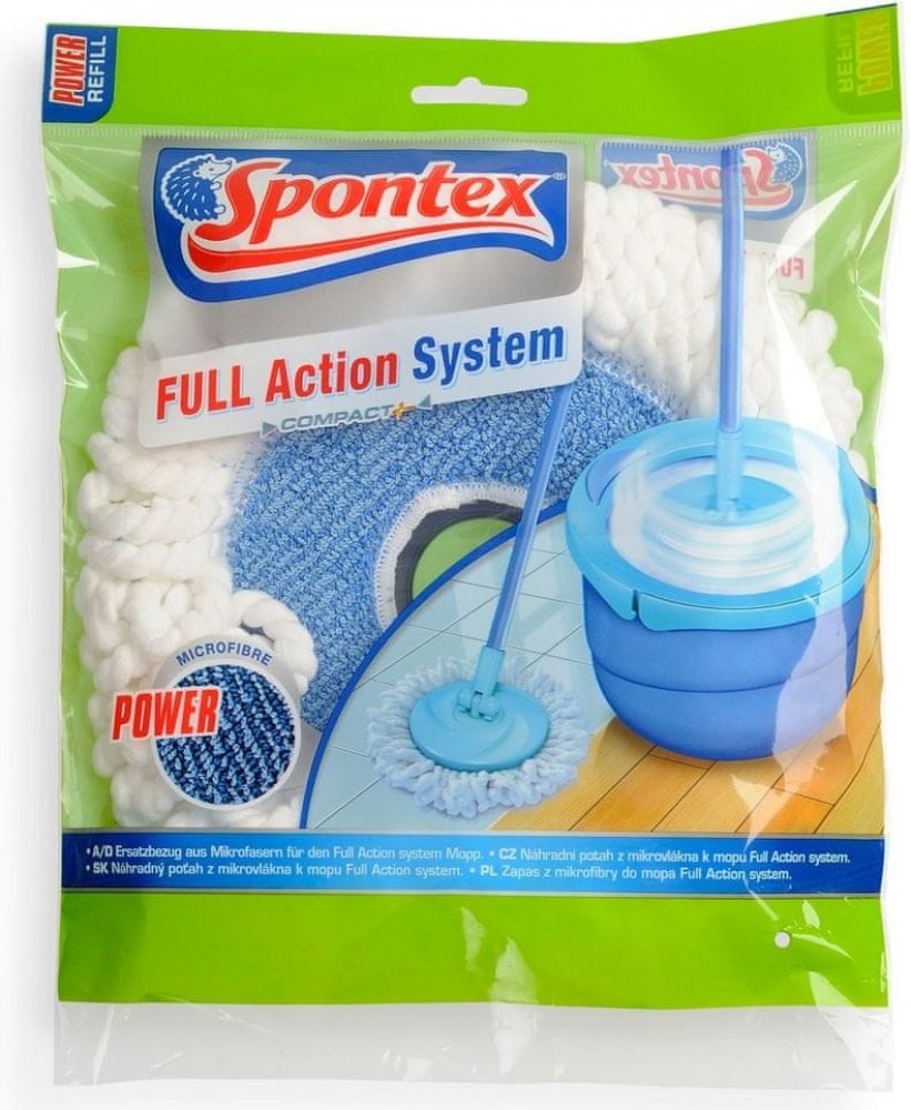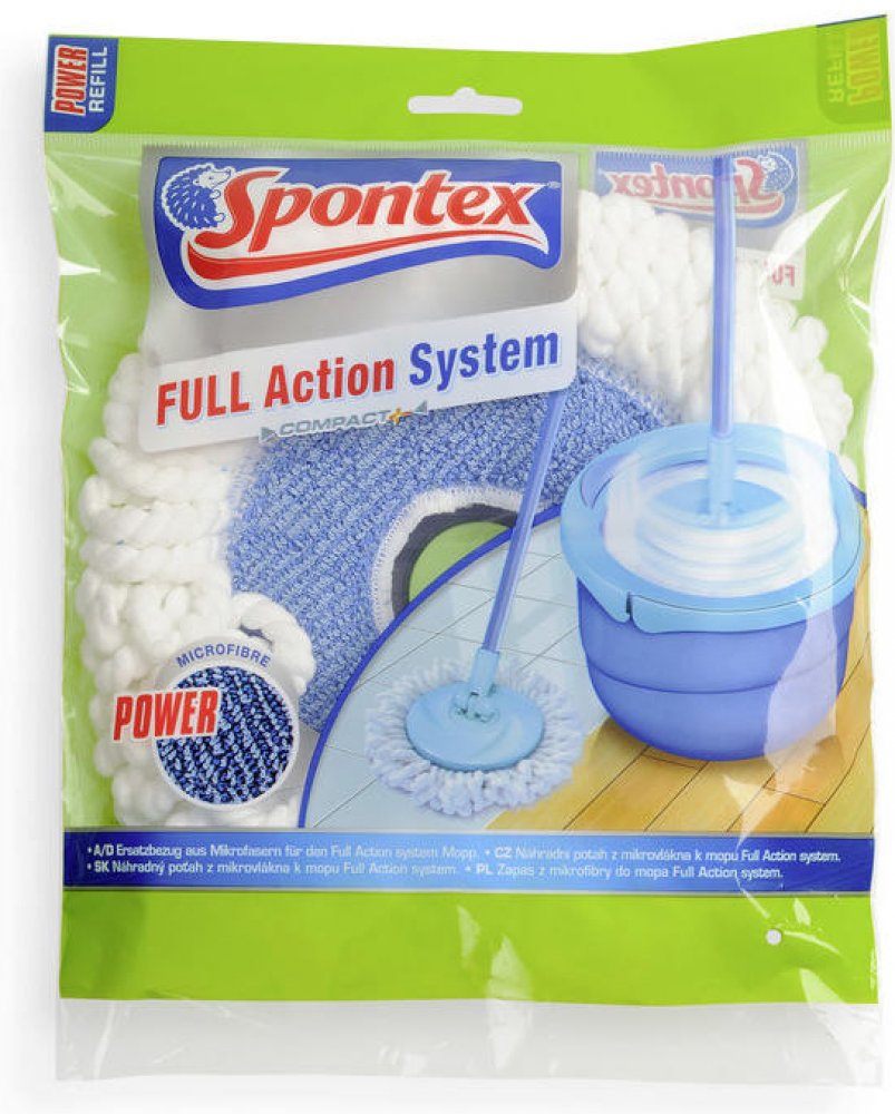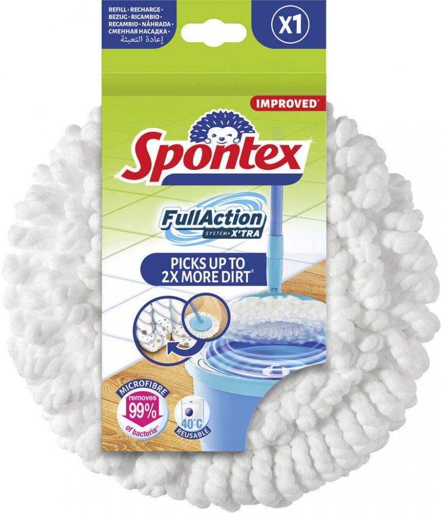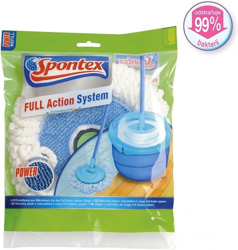 Nová verze náhrady s modrým středem pro mop Spontex Full Action systém pro ještě efektivnější čistění je vyrobena z mikrovlákna a snadno zachytí všechny nečistoty, které na podlaze ulpěly