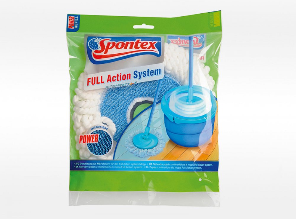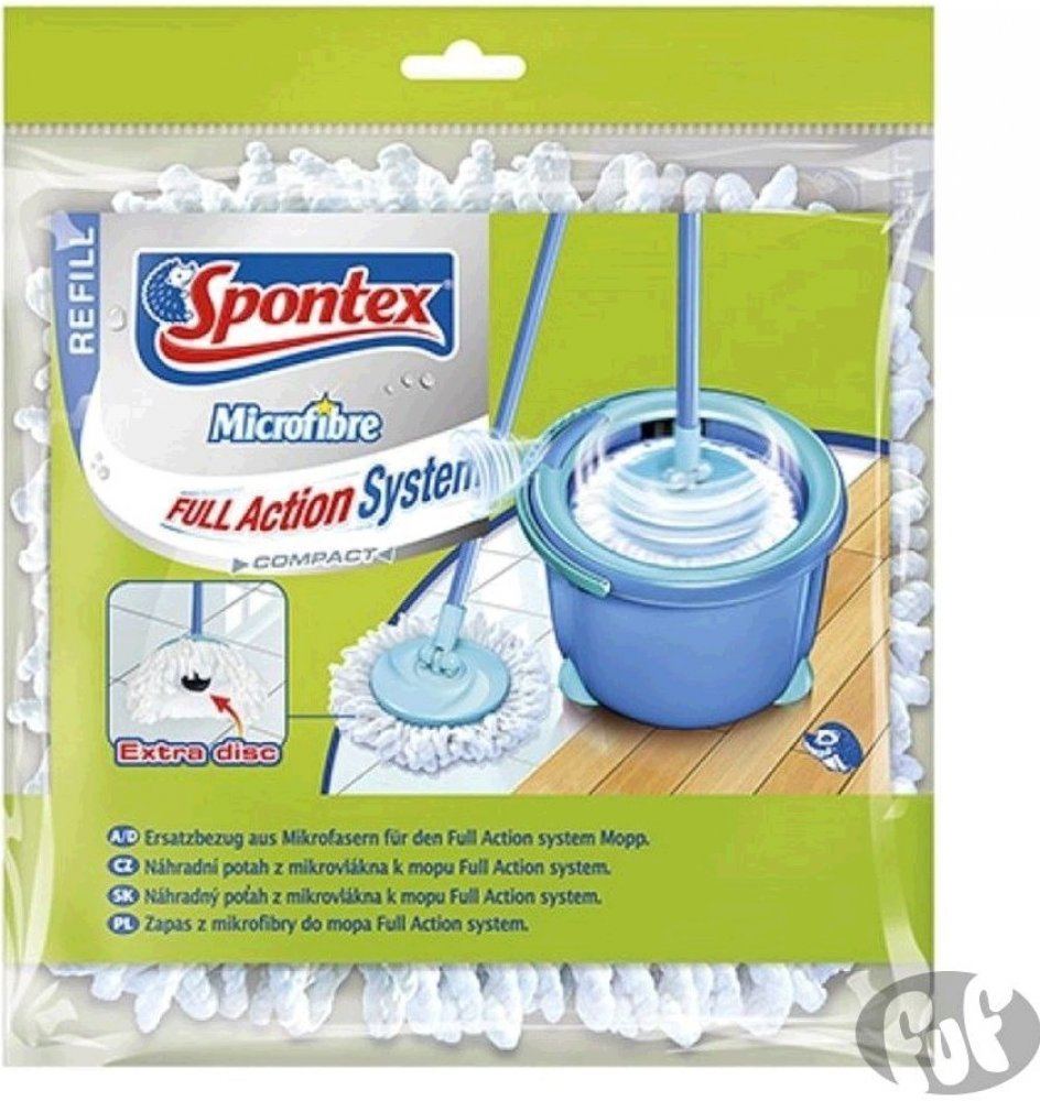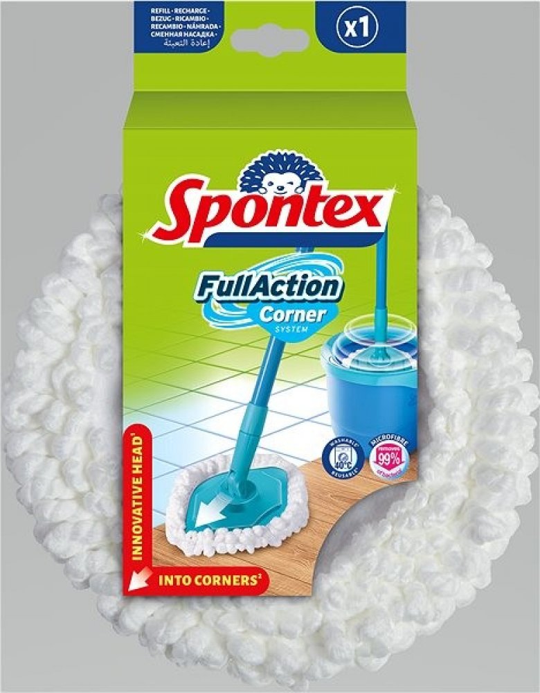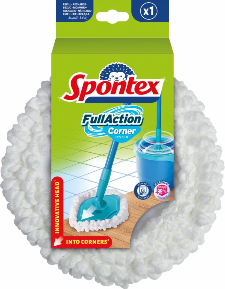 Nová verze náhrady s modrým středem pro mop Spontex Full Action systém pro ještě efektivnější čistění je vyrobena z mikrovlákna a snadno zachytí všechny nečistoty, které na podlaze ulpěly