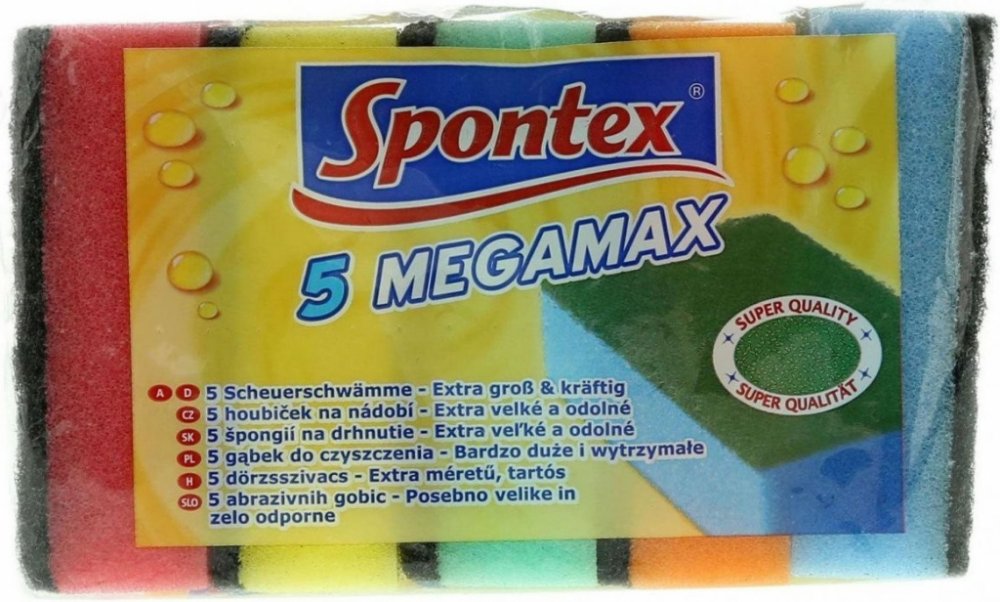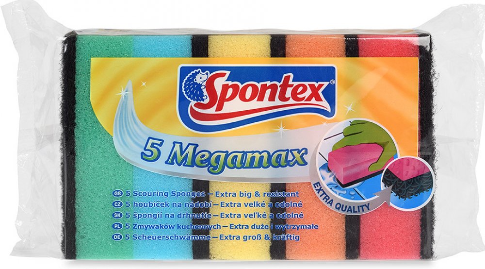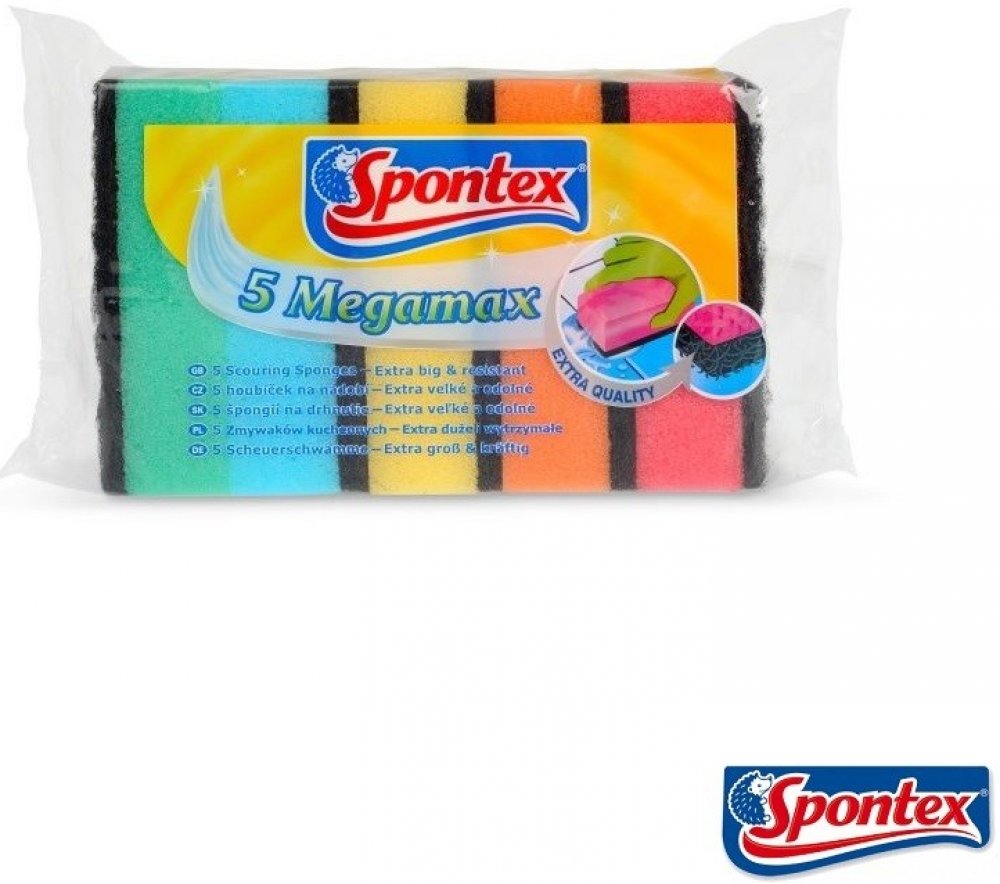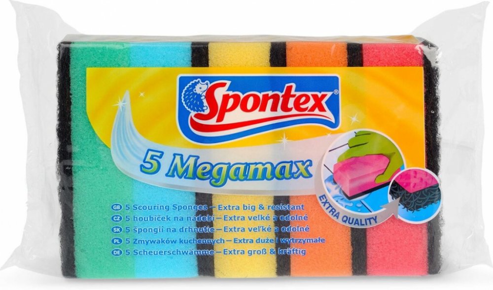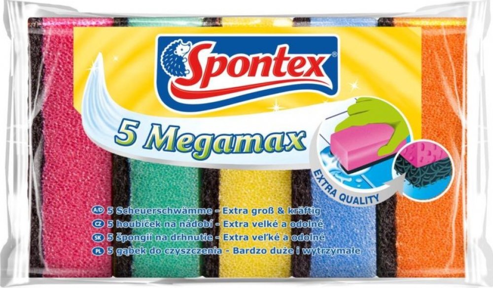 Spontex Megamax Houbičky na nádobí 5 ks jsou odolné a efektivní pomůcky pro snadné čištění nádobí a kuchyňských povrchů. Kombinace jemné strany a drsnější vrstvy umožňuje odstranění i odolných nečistot bez poškrábání.