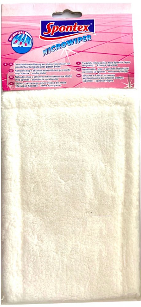 Spontex náhrada na mop Microwiper 44 x 14 cm. Náhradní univerzální mop o rozměru 44x14 cm s aktivním mikrovláknem pro plochý mop. Snadný a rychlý úklid. Složení: 70% polyester, 30% polyamid. Údržba: náhradu vždy vymáchejte v čisté vodě a vysušte po každém úklidu. Lze prát na 60°C, ale nebělit ani změkčovače.