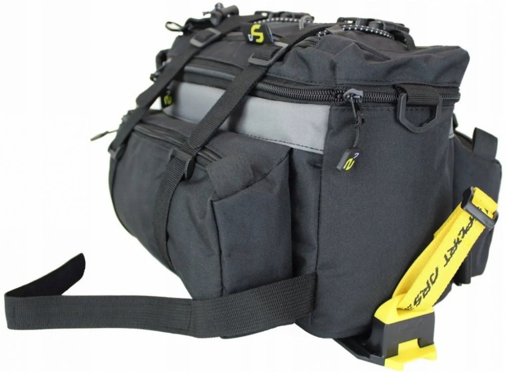 Univerzální taška s možností zvětšení objemu tašky – v případě rozepnutí horního zipu. Taška má jednu velkou vnitřní kapsu a dvě boční vnější kapsy na zip pro praktické rozložení zátěže. Upevnění tašky je snadné díky suchému zipu. Utáhněte dva kompresní pásy, abyste zajistili tažený náklad.