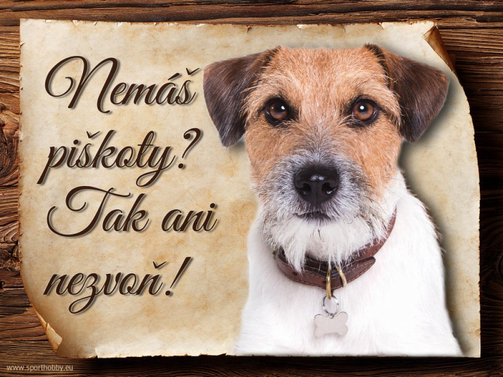 Cedulka Jack Russel Terier, hliníková s nápisem "Nemáš piškoty? Tak ani nezvoň!" Kovová výstražná venkovní cedulka oznamující to či ono, že se ve vašem obydlí může návštěvník setkat s vašim čtyřnohým miláčkem a jeho teritoriem. Velikosti těchto cedulek jsou 15x11,25 a 20x15 cm. Cedulky jsou tištěny sublimační technologií Grawerton přímo na plech. Cedulky dodáváme běžně se zakulacenými rohy. Pokud...