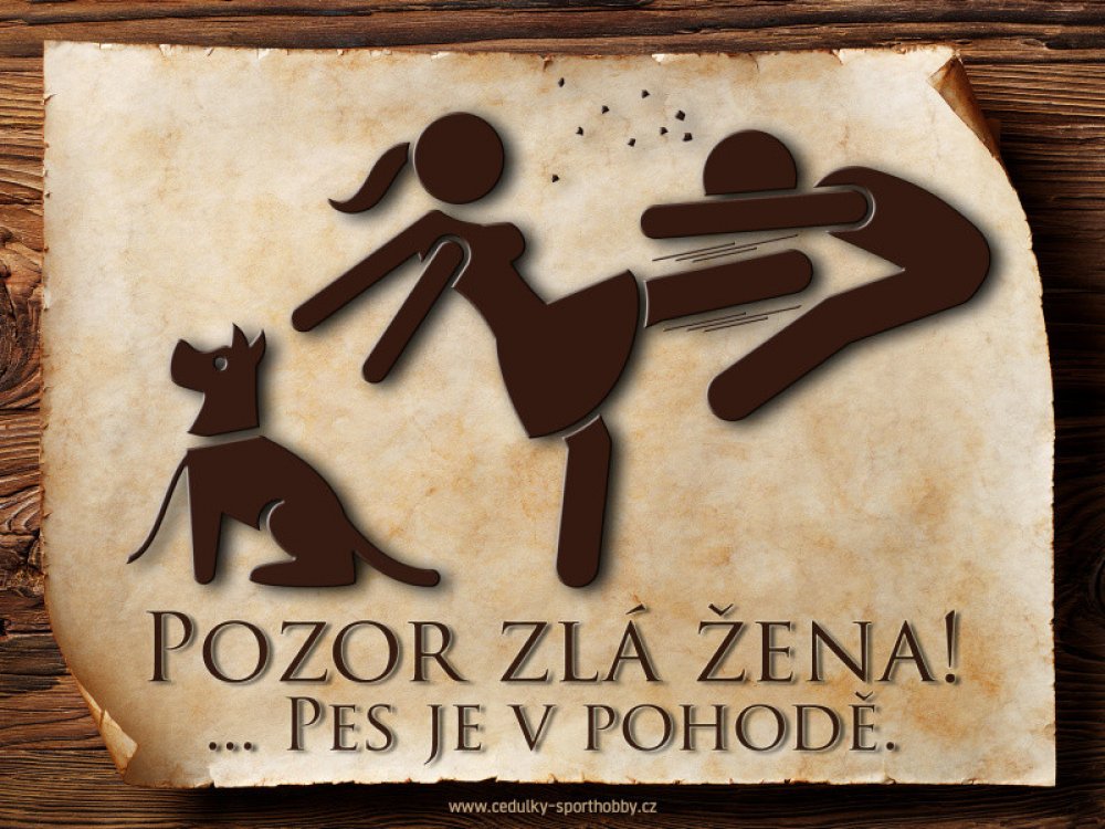 Vtipná cedulka s nápisem "Pozor zlá žena ..." v.9. Velikosti těchto cedulek jsou 15x11,25 a 20x15 a 26,7x20 cm.