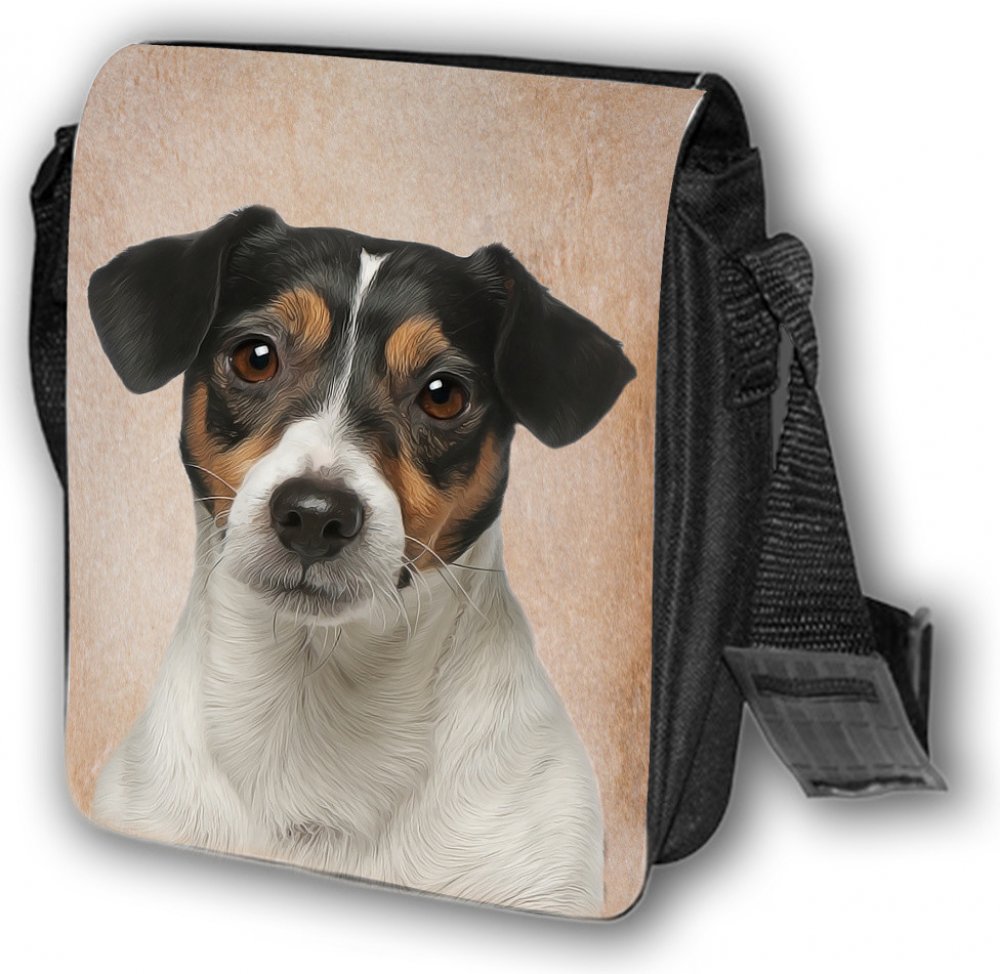 Nylonová vycházková taška s popruhem přes rameno, černé barvy. Velikost tašky je 21x20 cm. Na omyvatelné, odnímatelné ploše velikosti 17x20 cm je krásný paint potisk Jack russel terier.