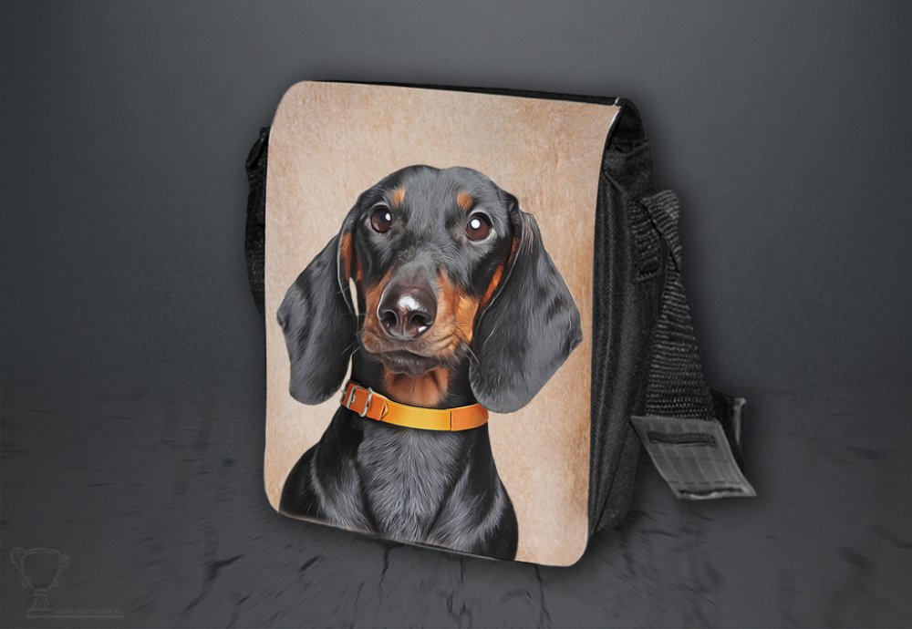 Nylonová vycházková taška s popruhem přes rameno, černé barvy. Velikost tašky je 21x20 cm. Na omyvatelné, odnímatelné ploše velikosti 17x20 cm je krásný paint potisk Jezevčík černý.