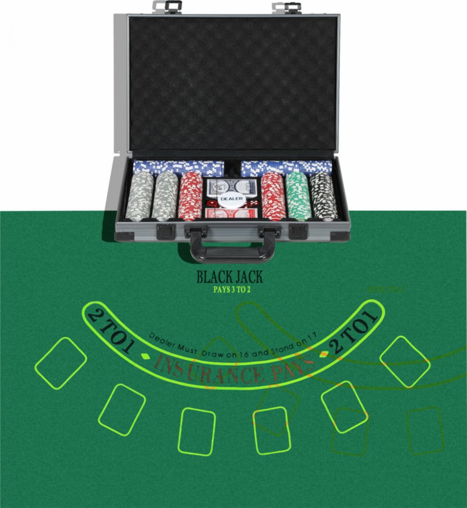 Kompletní pokerová sada se 400 žetony, dvěma balíčky karet, pěti kostkami, dealerským diskem a podložkou.