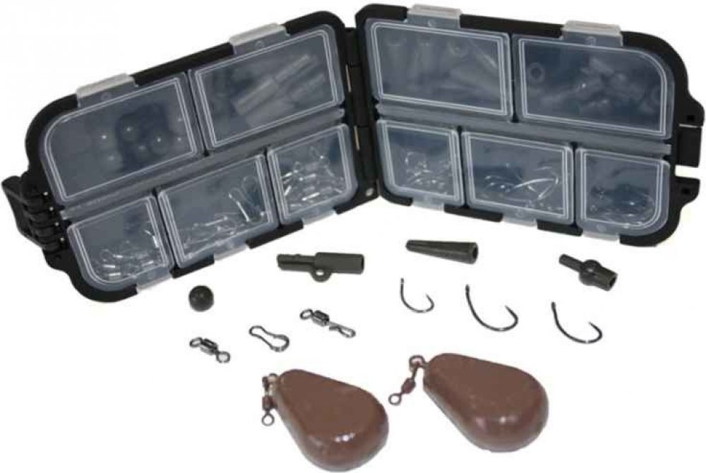 Krabička plná rybářské bižuterie potřebná k výrobě kaprařských montáži k lovu kapra. Obsahem krabičky jsou háčky, obratlíky, rychle upínací obratlíky, gumové konektory, korálky, bezpečnostní klipy konektorů a dělící rýchloklipy. Nezbytnou součástí montáží j