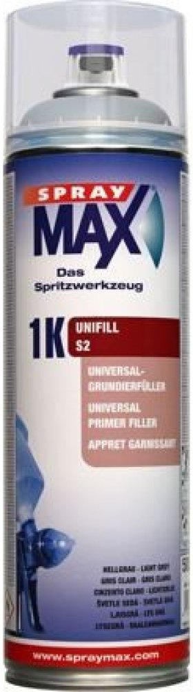 1K Akrylový plnič ve spreji SprayMax plnič se velice snadno nanáší , má dobrou přilnavost , excelentní povrch a možnost zbroušení , především při broušení za mokra. Je mimořádně vhodný na probroušená místa . Vytváří vysoké krycí vrstvy (2x 90qm) a velice rychle schne (15min/20°C). Je to nejoblíbenější plnič na našem kamenném obchodě. Nastavitelný kužel a úhel rozstřiku Jak je tomu u výrobků SprayMax zvykem, má variabilní trysku , se kterou si můžete nastavit vertikální či horizontální rozstřik . Dále je hlava opatřena regulátorem pro nastavení rozprachu . Obsah: 500ml Odstín: S2 Světle šedý Pro dosažení co nejlepšího výsledku při opravě nabízíme plniče v různých odstínech: S2 Světle šedý S4 Středně šedý S6 Tmavě šedý S7 Černý