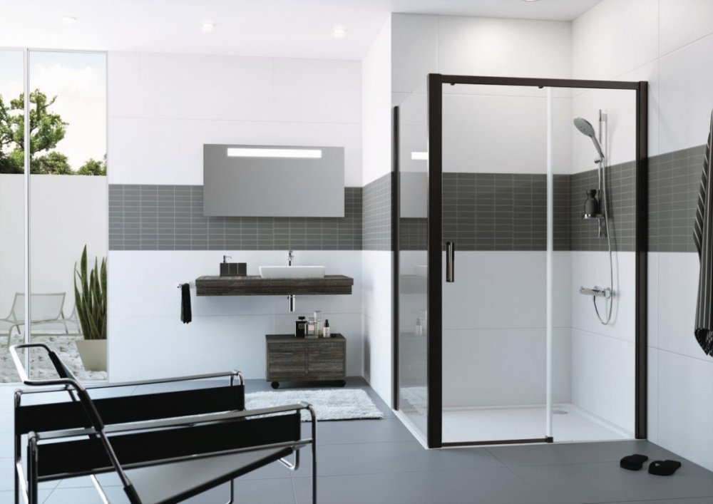 Sprchové dveře bez vaničky a barvou profilů v černé barvě, výplň je z čirého skla bez dekoru. Produkt je opatřen technologií Hüppe Anti-Plaque - povrchová úprava aplikovaná ve výrobě, která usnadňuje čištění a umožňuje jednoduché stékání vody v podobně drobných kapek. Posuvný systém otevírání. Určení - pravá orientace.