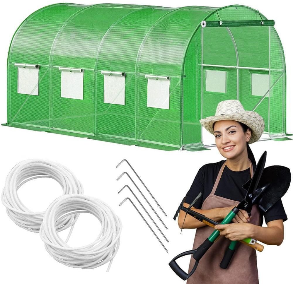 Praktické větrací síťovaná okna umožňují optimální cirkulaci vzduchu a regulaci vlhkosti. Široký vchod s roletkou a zipem usnadňuje přístup do fóliovníku, zatímco obvodové kotvy do země zajišťují pevné uchycení k podkladu. Tento fóliovník je skvělým pomocníkem pro každého zahrádkáře, který chce mít zdravou a bohatou úrodu po celou sezónu.
