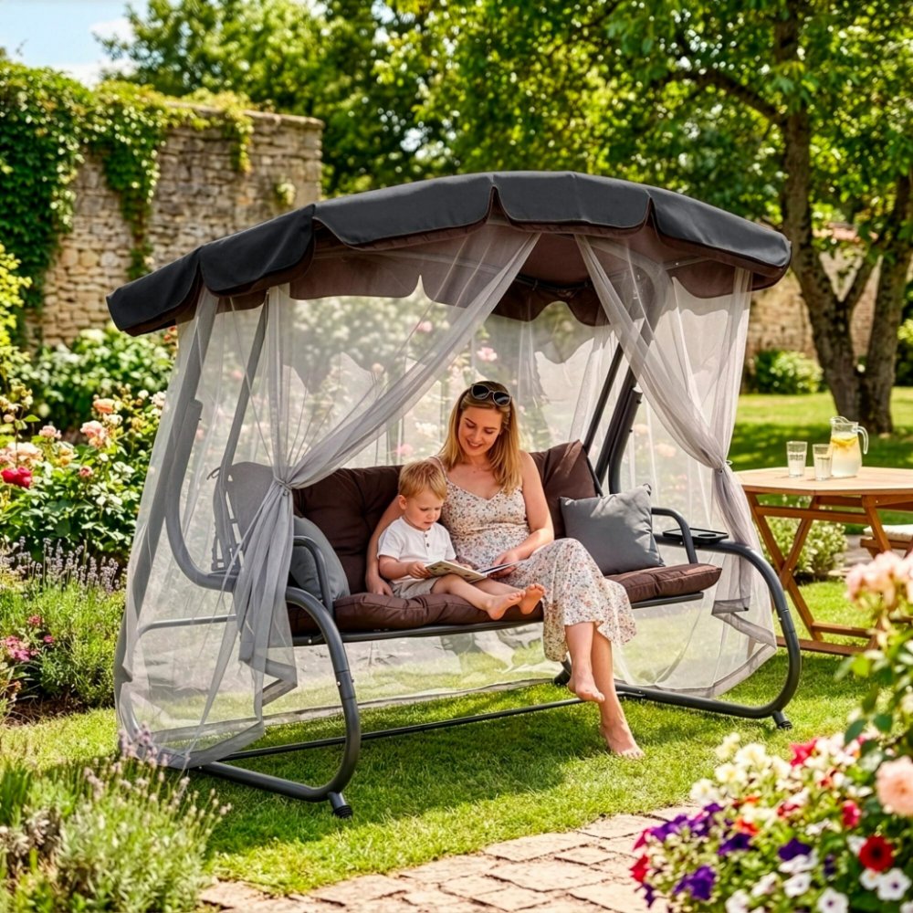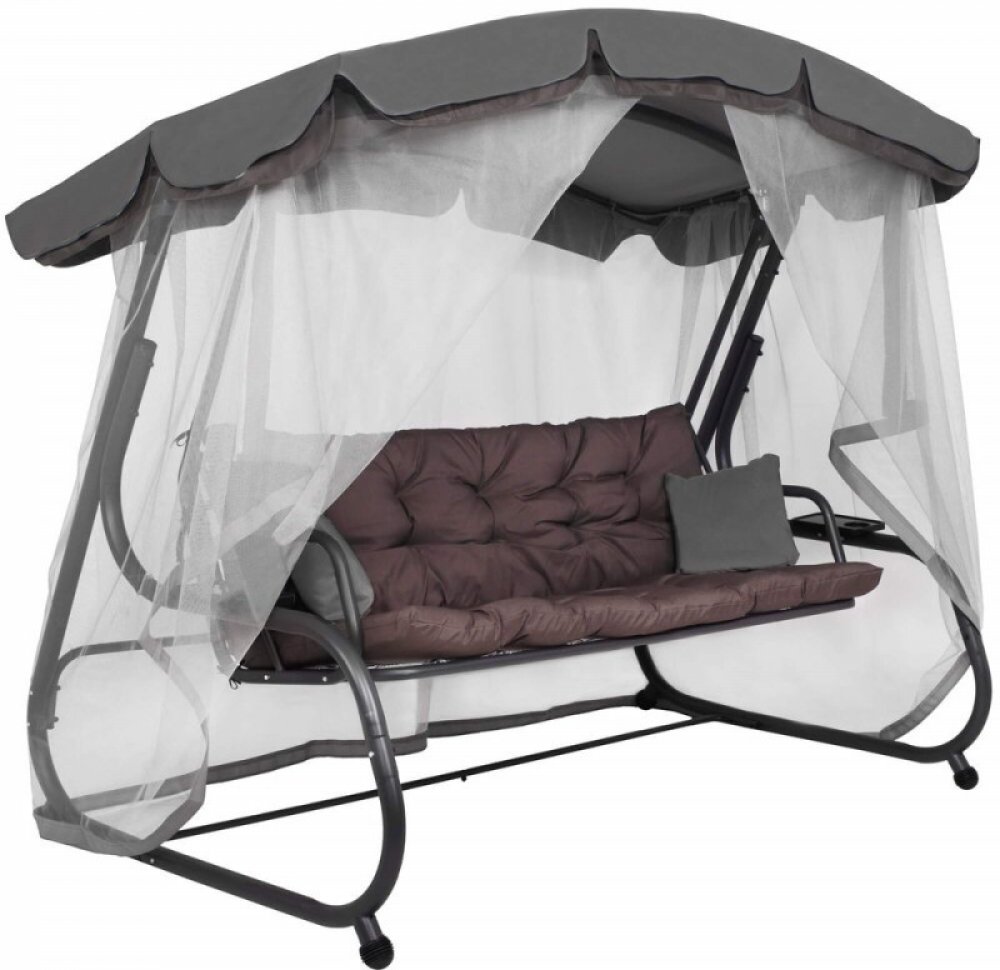 Luxusní zahradní houpačka pro 3-4 osoby s odnímatelnou moskytiérou, přepychově polstrovaným sedákem a 2 polštáři. Masivní kovová konstrukce, fukce lůžka, nastavitelný sklon stříšky, držáky nápojů, nosnost 260 kg.