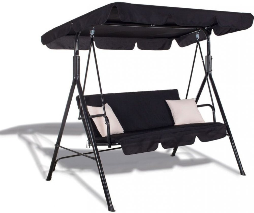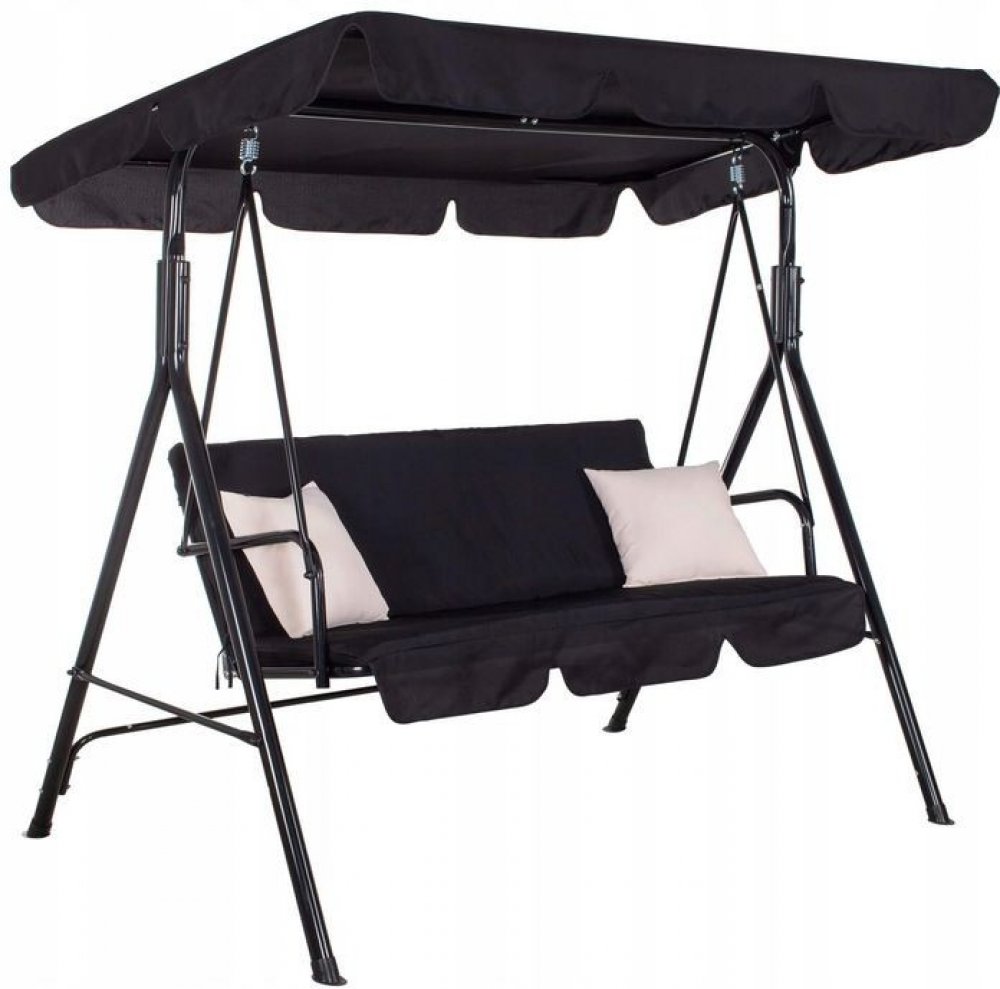 Pohodlná zahradní houpačka pro 3 osoby s pohodlným podsedákem a 2 polštáři. Černá barva, nosnost 220 kg. Pevný rám odolný proti poškození. Voděodolný materiál. Ochrana proti korozi. Nastavitelná stříška. Pružinové uchycení. Protiskluzové konce nohou.