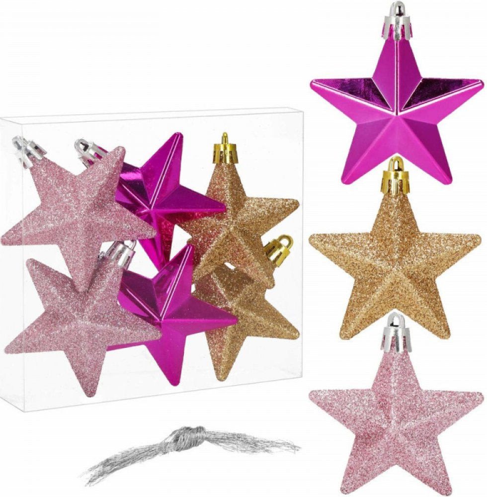 Sada 6 ks růžovo-zlatých ozdob na stromeček s motivem hvězdy. Výška ozdoby 7 cm, lesklé a třpytivé provedení, poutko na zavěšení, nerozbitný plastový materiál. Ideální k výzdobě stromečku nebo jako vánoční dekorace. Zdarma provázky pro snadné zavěšení.Sada ozdob je vyrobena z kvalitního nerozbitného plastu a svým provedením věrně připomíná skleněné dekorace. Oproti nim je však mnohem odolnější a b...