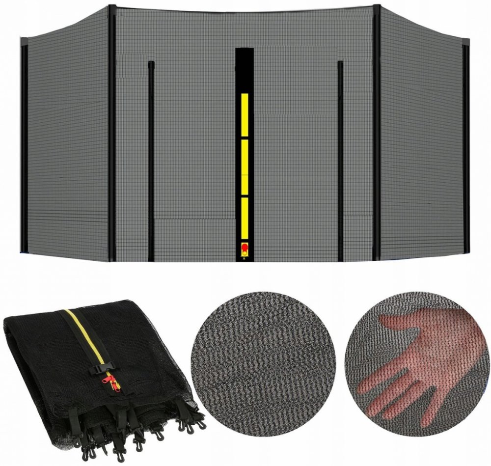 Vstupní otvor je zajištěn zipem a bezpečnostími přezkami proti nechtěnému otevření. Spodní strana je vybavena pružnými pásky s karabinkou pro snadné upevnění ke konstrukci trampolíny.