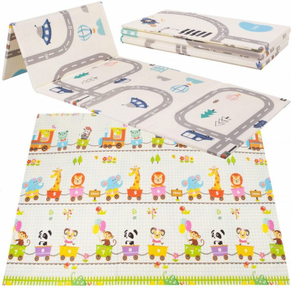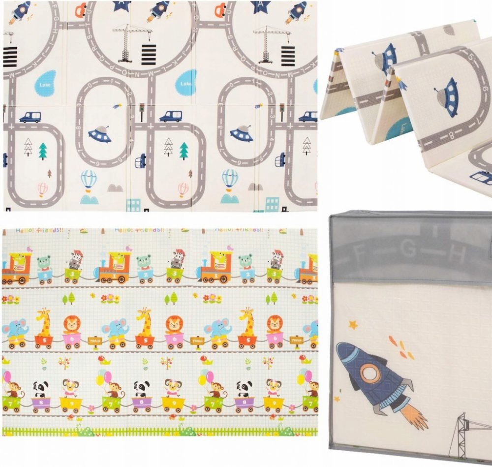- Podložka oboustranná. Na jedné straně vzor ulic a vozidel na pozadí ecru. Na druhé straně rohože vzor barevných vláčků se zvířátky a modrá mřížka na pozadí ecru.