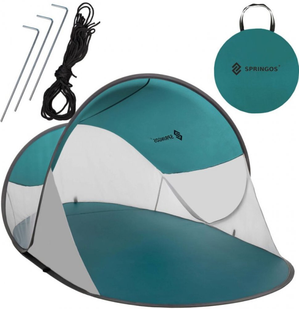Samorozkládací plážový stan SPRINGOS TEXAS zeleno-šedý je ideálním řešením pro pohodlný pobyt na pláži, u vody nebo na zahradě. Díky POP-UP systému se stan sám rozloží během několika sekund, bez nutnosti složité montáže. Nabízí velké rozměry 120×190×100 cm, takže poskytne dostatek prostoru pro odpočinek i úschovu věcí. Stan má voděodolnou podlahu, UV filtr 50+ a flexibilní sklolaminátovou konstrukci, která zajišťuje odolnost vůči větru a vlhkosti.